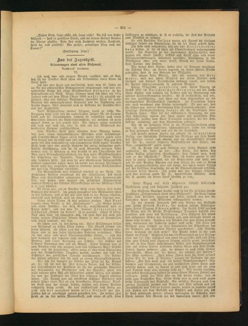 Ich war von Haus aus musikalisch, hatte vom 10. Jahre an im Alt des akademischen Gesangvereins mitgesungen und war eine wesentliche Stütze des alten Musikdirektors Hofmann in der Gesangstunde als Altist. Meine Stimme brach sich schon mit U1/2 Jahren und aus dem Mtus Ostern 1850 m ußte ich, gänzlich ungeschult, aber mit kräftiger Baßstimme (horribile dictu) die große Baßarie mit vvrausgehendem Rezitativ aus der Schöpfung von» Haydn singen, 1851 ebenfalls noch in Sekunda die Sarastro-Arie