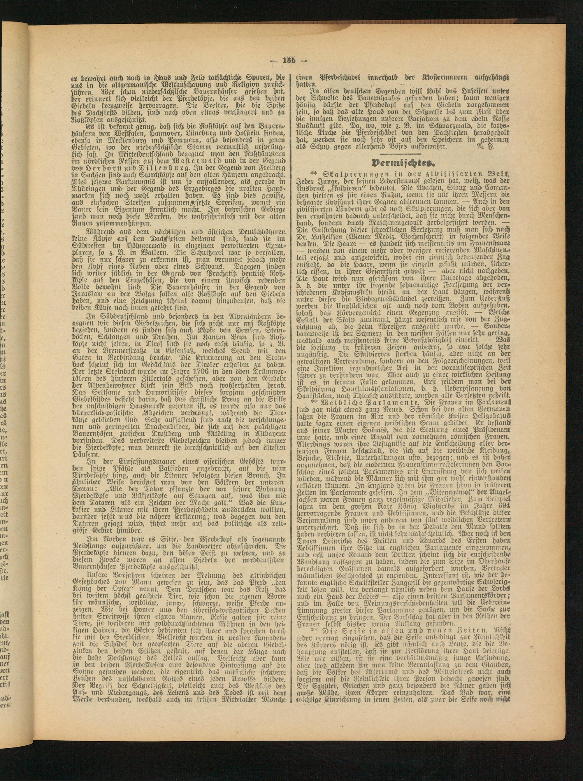 In allen deutschen Gegenden will Kohl das Hufeisen unter der Schwelle des Bauernhauses gefitnden haben; kaum weniger häufig dürste der Pferdekopf auf den Giebeln vorgekommen sein, so daß das alte Haus von der Schwelle bis zum First über die innigen Beziehungen nnserer Vorfahren zu dem edeln Rosse Auskunft gibt. Da, wo, wie z. B. im Schwarzwald, die katholische Kirche die Pserdeschädel von den Dachfirsten herabgeholt hat, werden sie noch sehr oft auf den Speichern im geheimen als Schtttz gegen allerhand Böses aufbewahrt. Ar F.