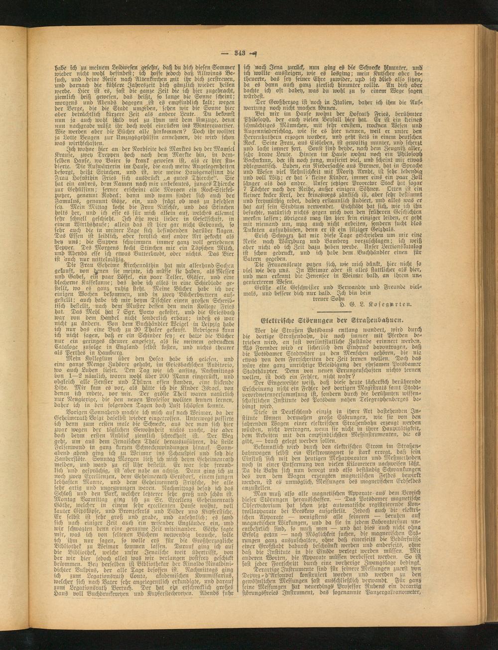 Vorigen Sonnabend machte ich mich auf nach Weimar, da der Geheimerath Voigt daselbst wieder eingetroffen. Unterwegs passirte ich denn zum ersten male die Schnecke, aus der man sich hier zwar wegen der täglichen Gewohnheit nichts macht, die aber doch beym ersten Anblick ziemlich schreckhaft ist. Der Weg geht, um aus dem Jenaischen Thal« herauszusühren, die steile Felsenwand in ganz kurzen Schneckeitwindungen hinaus. Sottn- abend .abend ging ich zu Weimar ins Schauspiel und sah die Zaiiberflöte. Sonntag Morgen ließ ich mich beym Geheimenrath melden, und ward zu elf Uhr bestellt. Er war sehr freundlich und gesprächig, ist 'aber nahe an achtzig. Dann ging ich zu noch zwey Exeellenzen, dem Geheimerath Gersdorf, einem jungen lebhaften Manne, und dem Geheimenrath Fritzsche, die alle sehr artig und ungezwungen waren. Nachmittags besah ich das Schloß und den Park, welcher letzterer sehr groß und schön ist. Montag Bormittag ging ich zu Sr. Excelleuz Geheimenrath Göthe, welcher in einem! sehr excellenten Hause wohnt, voll lauter GiPsKpfe, und Bronzekerls und Bilder und Kupferstiche. Er selbst ist sehr groß und grade, und ansehnlich; es fand sich nach einiger Zeit auch 'ein reisender Engländer ein, und wir schwazten denn eine geraume Zeit miteinander. Göthe sagte mir, was ich von seltenen Büchern notwendig brauche, solle ich ihm nur sagen, so wolle ers für die Großherzogliche Bibliothek zu Weimar stimmen lassen. Darauf ging ich auf die Bibliothek, welche unsre Jdnaische weit übertrifft, von der wir hier jedoch alles was wir verlangen postfrey geschickt bekommen. Bey derselben ist Bibliothekar der Rinaldo Rinaldini- dichter Bulpius, der alle Tage besoffen ist. Nachmittags ging ich zum Legationsrath Eonta, akademischen Kommifsarius, welcher sich nach Vater sehr angelegentlich erkundigte, und darauf zunt Legationsräth Bertuch. Der hat ein erschrecklich großes Haus voll Bnchdruckereyen und Kupferstechereyen. Abends fuhr