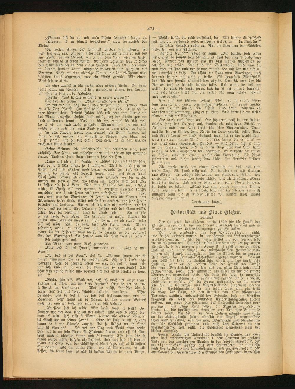 „Greta, hör uff. Mach net, daß ich mich net mehr kenn! hoschte net alles, was bei Herz begehrt? Sitzt de net do, wie it Bogel im Hanfsarne? — Was de willst, kannschte dir jo kaafe, nor net mit so’m Fludder sollschte erumlaafe. — Dhue darfschte, was de willst, nor laß des Scharinuzieren mit ’m Hesseiner. Geh’ naus an de Rhein, wo die annere Weiwep aach siu, arnesier dich, nor mach mer kää Schänd.77