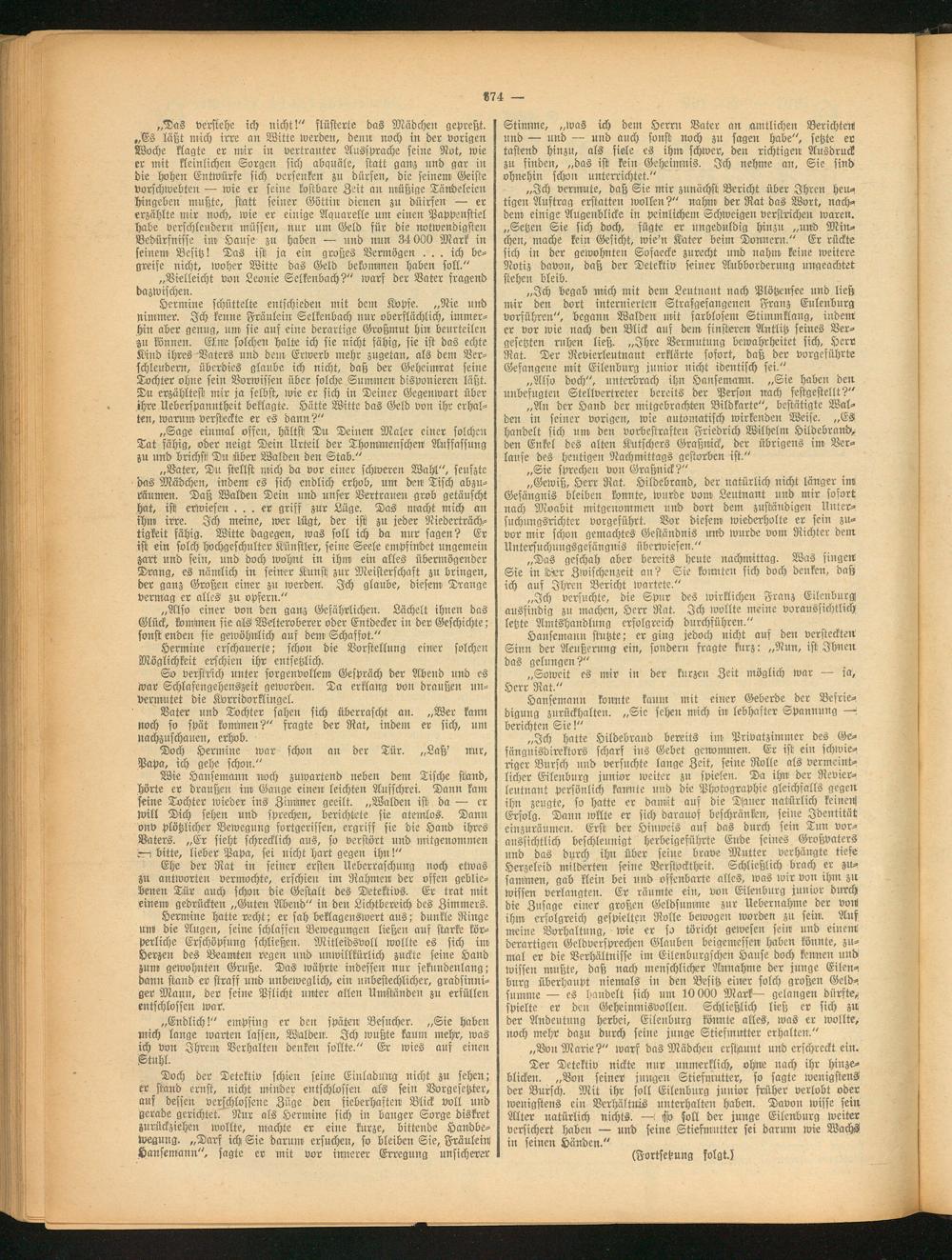 Hermine schüttelte entschieden mit dem Kopfe. „Nie und nimmer. Ich kenne Fräulein Selkenbach nur oberflächlich, immerhin aber genug, um sie auf eine derartige Großmut hin beurteilen zu können. Eine solchen halte ich sie nicht fähig, sie ist das echte Kind ihres Vaters und dein Erwerb mehr zugetan, als dem Verschleudern, überdies glaube ich nicht, daß der Geheimrat seine Tochter ohne sein Vorwissen über solche Summen disponieren läßt. T-u erzähltest mir ja selbst, wie er sich in Deiner Gegenwart über ihre Ueberspanntheit beklagte. Hütte Witte das Geld von ihr erhalten, warum versteckte er es dann?"