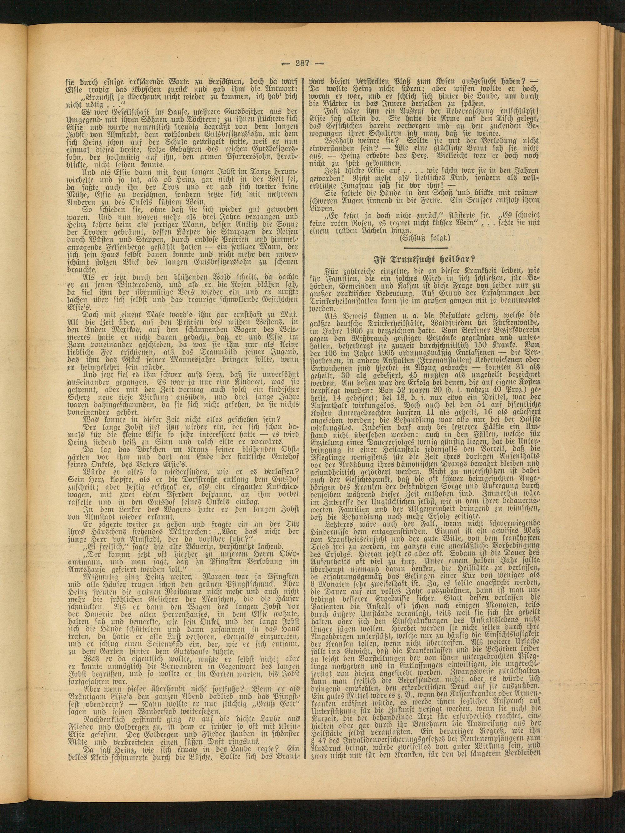 Doch mit einem Male ward's ihm gar ernsthaft zu Mut. All die Zeit über, auf den Prärien des wilden Westens, üt den Anden Mexikos, auf den schäumenden Wogen des Weltmeeres hatte er nicht daran gedacht, daß er und Elsie im Zorn voneinander geschieden, da tvar sie ihm nur als kleine liebliche Fee erschienen, als das Traumbild seiner Jugend, das ihm das Glück seiner Mannesjahre bringen sollte, trenn er heimgekehrt sein würde.