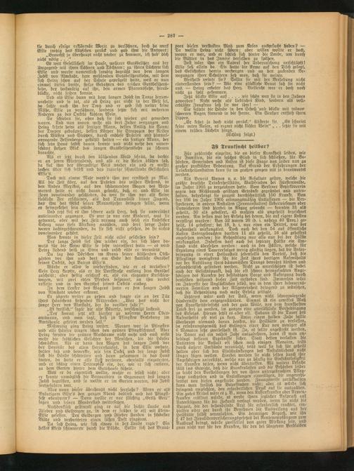 Als Beweis können u. a. die Resultate gelten, welche bte größte deutsche Triukerheilstätte, Waldstieben bei Fürstenwalde, im Jahre 1905 zu verzeichnen hatte. Vom Berliner Bezirksverein gegen den Mißbrauch geistiger Getränke gegründet und utiter- halten, beherbergt sie zurzeit durchschnittlich 150 Kranke. Von der 106 im Jahre 1905 ordnungsmäßig Entlassenen — die Verstorbenen, in andere Anstalten (Irrenanstalten) Ueberwiesenen oder Entwichenen sind hierbei in Abzug gebracht — konnten 31 als geheilt, 30 als gebessert, 45 mußten als ungeheilt bezeichnet werden. Am besten war der Erfolg bei denen, die auf eigene Kosten verpflegt wurden: Von 52 waren 20 (b. i. nahezu 40 Proz.) geheilt, 14 gebessert; bei 18, b. i. nur etwa ein Drittel, war der Aufenthalt wirkungslos. Doch auch bei den 54 auf öffentliche Kosten Untergebrachten durften 11 als geheilt, 16 als gebessert angesehen werden; die Behandlung war also nur bei der Hälfte wirkungslos. Indessen darf auch bei letzterer Hälfte ein Umstand nicht übersehen werden: auch in den Fällen, welche für Erzielung eines Tanererfolges wenig günstig liegen, hat die Unterbringung in einer Heilanstalt jedenfalls den Vorteil, baß bte Pfleglinge wenigstens für die Zeit ihres dortigen Aufenthalts vor der Ausübung ihres dämonischen Drangs bewahrt bleiben und gesundheitlich gefördert werden. Nicht zu unterlaßen tst habet auch der Gesichtspunkt, daß die oft schwer heimgesuchten Angehörigen des Kranken der beftänbigen Sorge und Aufregung durch denselben während dieser Zeit enthoben sind. Immerhin wäre im Interesse der Unglücklichen selbst, wie in dem ihrer bedauernswerten Familien und der Allgemeinheit dringend zu wünschen, daß die Behandlung noch mehr Erfolg zeitigte.