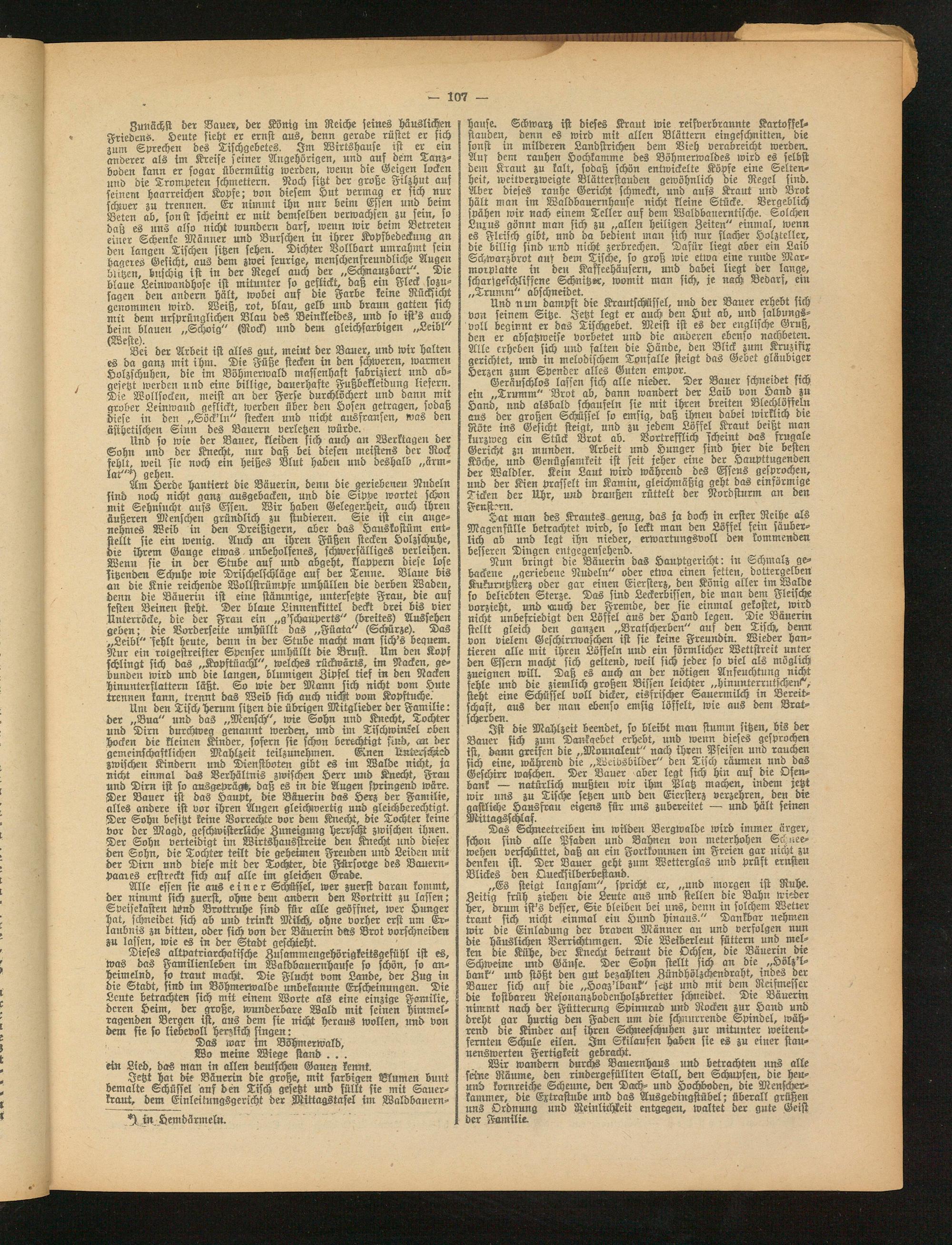 Dieses altpatriarchalische Zusammengehörigkestsgefühl ist es, was das Familienleben im Waldbauernhause so schön, so anheimelnd, so traut macht. Die Flucht vom Lande, der Zug in die Stadt, sind im Böhmerwalde unbekannte Erscheinungen. Die Leute betrachten sich mit einem Worte als eine einzige Familie, deren Heim, der große, wunderbare Wald mit seinen himmel- ragenben Bergen ist, aus dem sie nicht heraus wollen, und von dem sie so liebevoll Herzlich singen: