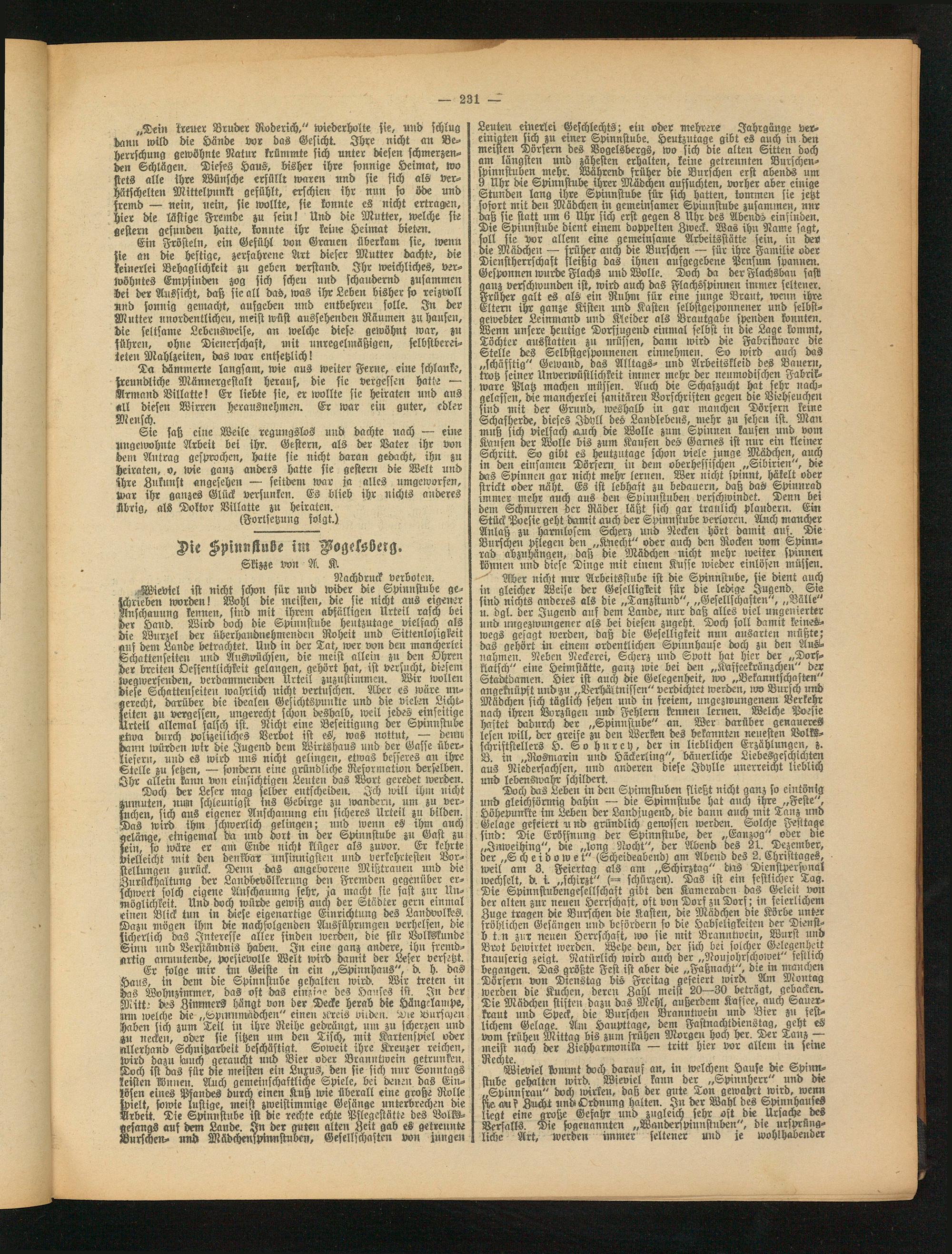 Doch der Leser mag selber entscheiden. Ich will ihm nicht Minuten, nun schleunigst ins Gebirge zu wandern, um zu ver- strchen, sich aus eigener Anschauung ein sicheres Urteil zu bilden. Das wird ihm schwerlich gelingen; und wenn es ihm auch gelänge, einigemal da und dort in der Spinnstube zu Gast zu jein, so wäre er am Ende nicht klüger als zuvor. Er kehrte vielleicht mit den denkbar unsinnigsten und verkehrtesten Vorstellungen zurück. Denn das angeborene Mißtraue!« und die Zurückhaltung der Landbevölkerung den Fremden gegenüber erschwert solch eigene Anschauung sehr, ja macht sie fast zur Unmöglichkeit. Und doch würde gewiß auch der Städter gern einmal einen Blick tun in diese eigenartige Einrichtung des Landvolkes. Dazu -mögen ihm die nachfolgenden Ausführungen verhelfen, die sicherlich das Interesse aller finden werden, die für Volkskunde Sinn und Verständnis haben. In eine ganz andere, ihn fremd- inxtig anmutende, poesievolle Welt wird damit der Leser versetzt.