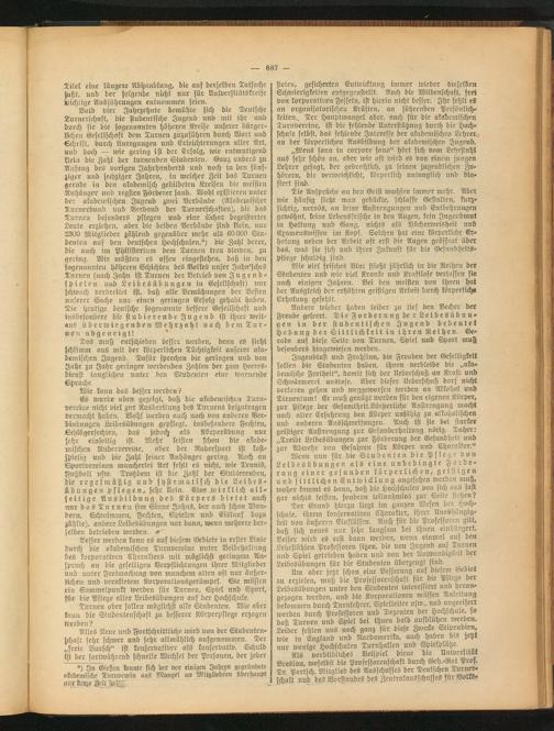 Es wurde oben gezeigt, daß die akademischen Turnvereine nicht viel zur Ausbreitung des Turnens beizutragen vermocht haben. Wohl werden auch noch von anderen Verbindungen Leibesübungen gepflegt, insbesondere Fechten, Schlägerfechten, das jedoch als Körperübung nur sehr einseitig ist. Mehr leisten schon die akademischen Rudervereine, aber der Rudersport ist kostspielig und die Zahl seiner Anhänger gering. Auch au Sportvereinen mancherlei Art fehlt es nicht, wie Tennis, Fußball usw. Trotzdem ist die Zahl der Studierenden, die regelmäßig und systematisch die Leibesübungen pflegen, sehr klein. Eine wirklich all- seitige Ausbildung des Körpers bietet auch nur das Turnen (im Sinne Jahns, der auch schon Wandern, Schwimmen, Fechten, Spielen und Eislauf dazu zählte), andere Leibesübungen nur dann, wenn mehrere derselben betrieben werden. «