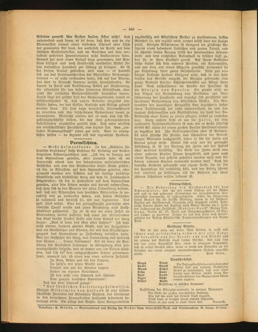 Auflösung der Königspromenade in voriger Nummer: Nie stirbt ein großer menschlicher Gedanke, Wie tief ihn auch des Lebens Wust begräbt, Stets kann er brechen seines Lebens Schranke, Weint er nur noch in einer Seele lebt. Raupach.