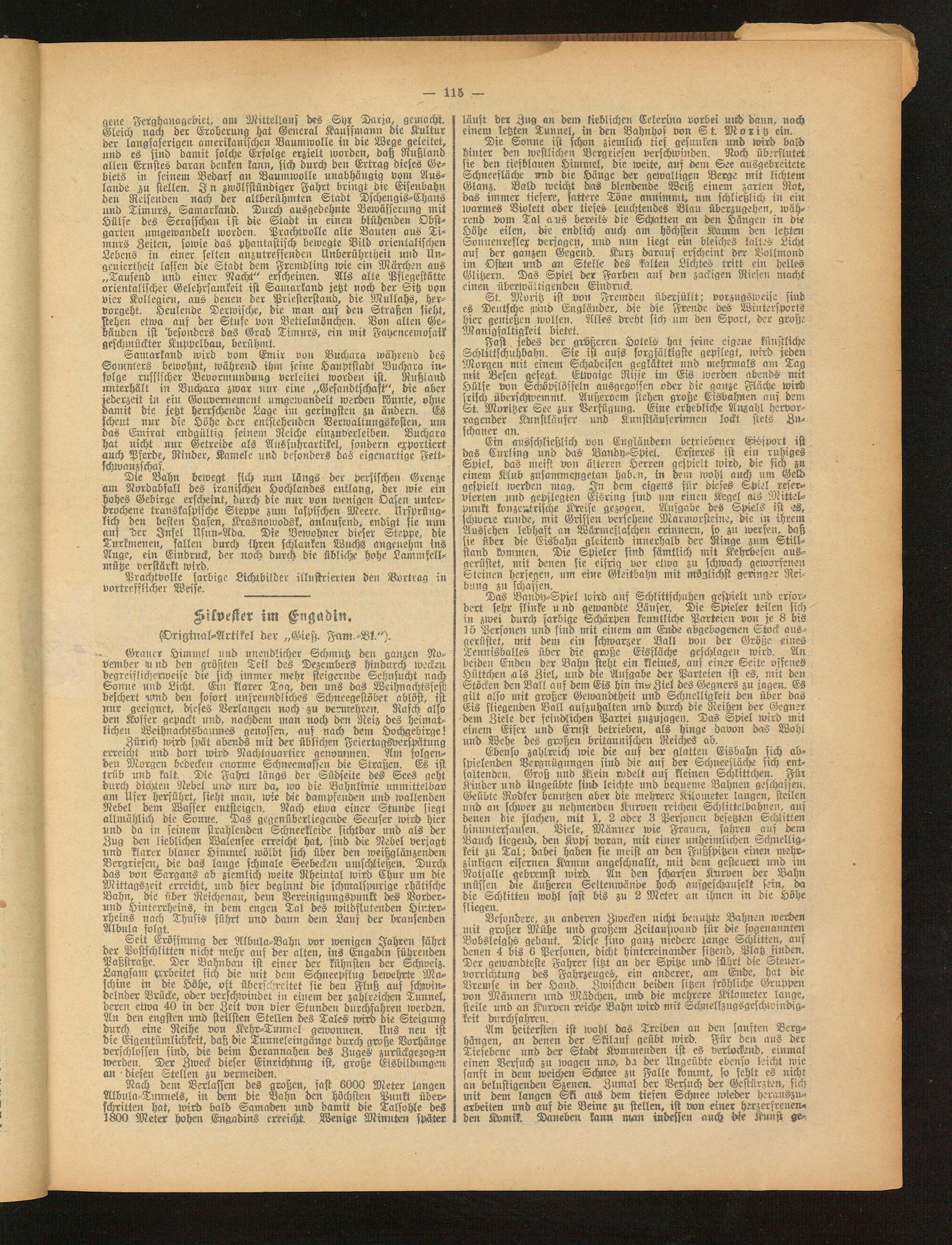 Seit Eröffnung der Albula-Bahn vor wenigen Jahren fährt der Postschlitten nicht mehr auf der alten, ins Engadin führenden Paßstraße. Der Vahnbau ist einer der kühnsten der Schweiz. Langsam arbeitet sich die mit dem Schneepflug bewehrte Maschine in die Höhe, oft überschreitet sie den Fluß auf schwindelnder Brücke, oder verschwindet in einem der zahlreichen Tunnel, deren etwa 40 in der Zeit von vier Stundest durchfahren werden. An den engsten und steilsten Stellen des Tales wird die Steigung durch eine Reihe von Kehr-Tunnel gewonnen. Uns neu ist die Eigentümlichkeit, daß die Tunneleingänge durch große Vorhänge verschlossen sind, die beim Herannahen des Zuges zurückgezogen werden. Der Zweck dieser Einrichtung ist, große Eisbildungen an diesen Stellen zu vermeiden.