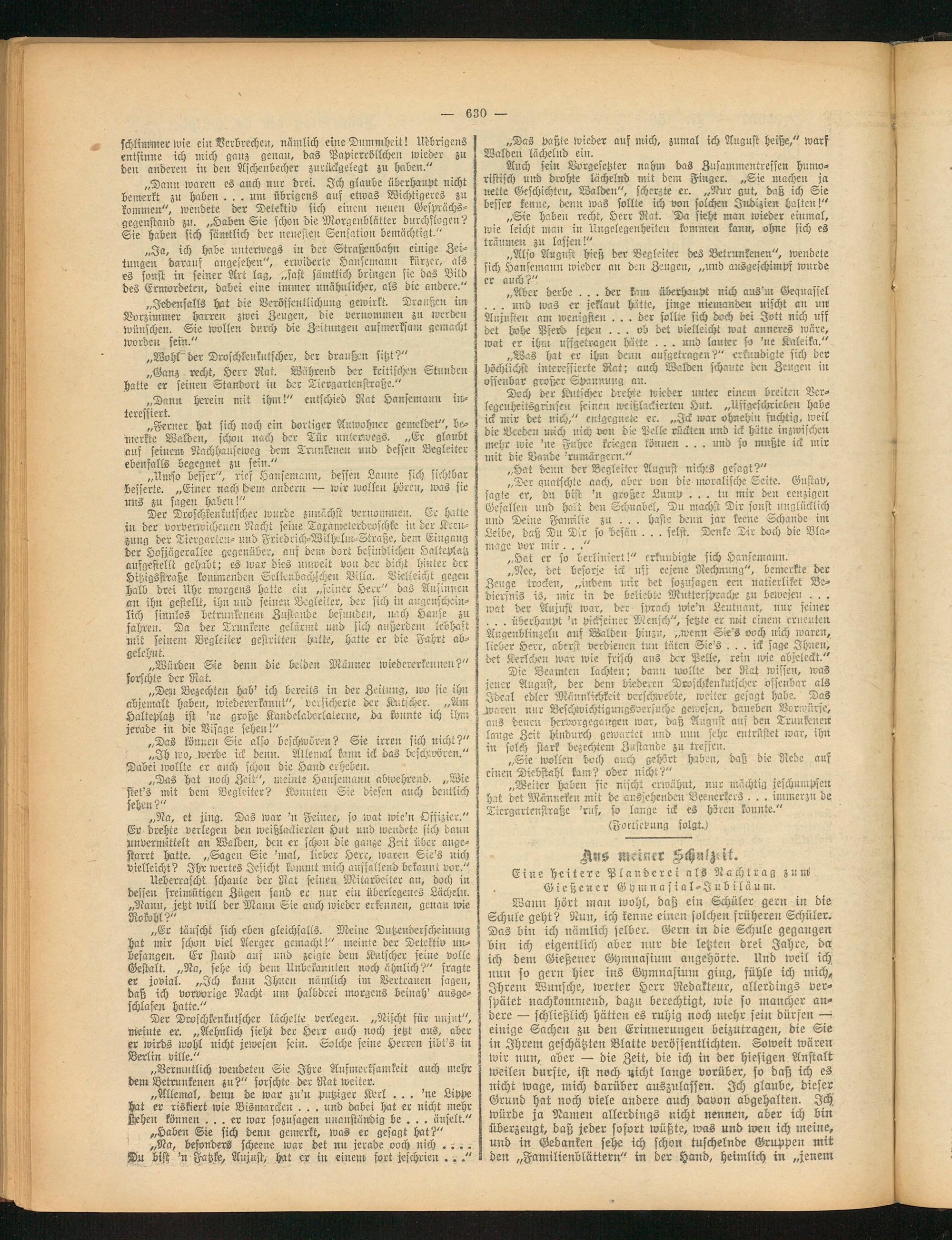 Wann hört man wohl, daß ein Schüler gern in die Schule geht? Nun, ich kenne einen solchen früheren Schüler. Das bin ich nämlich selber. Gern in die Schule gegangen bin ich eigentlich aber nur die letzten drei Jahre, da ich dem Gießener Gymnasium angehörte. Hub weil ich nun so gern hier ins Gymnasium ging, fühle ich nnchz Ihrem Wunsche, werter Herr Redakteur, allerdings verspätet uachkymnienb, dazu berechtigt, wie so mancher andere — schließlich hätten es ruhig noch mehr fein dürfen —: einige Sachen zu den Erinnerungen beizutragen, die Sie in Ihrem geschätzten Blatte veröffentlichten. Soweit wären wir nun, aber — die Zeit, die ich in der hiesigen Anstalt weilen durste, ist noch nicht lange vorüber, so daß ich es nicht wage, mich darüber auszulassen. Ich glaube, dieser Grund hat noch viele andere auch davon abgehalten. Ich würde ja Namen allerdings nicht nennen, aber ich bin überzeugt, daß jeder sofort wüßte, was und wen ich meine, und in Gedanken sehe ich schon tuschelnde Gruppen mit den „Familienblättern" in der Hand, heimlich in „jenem