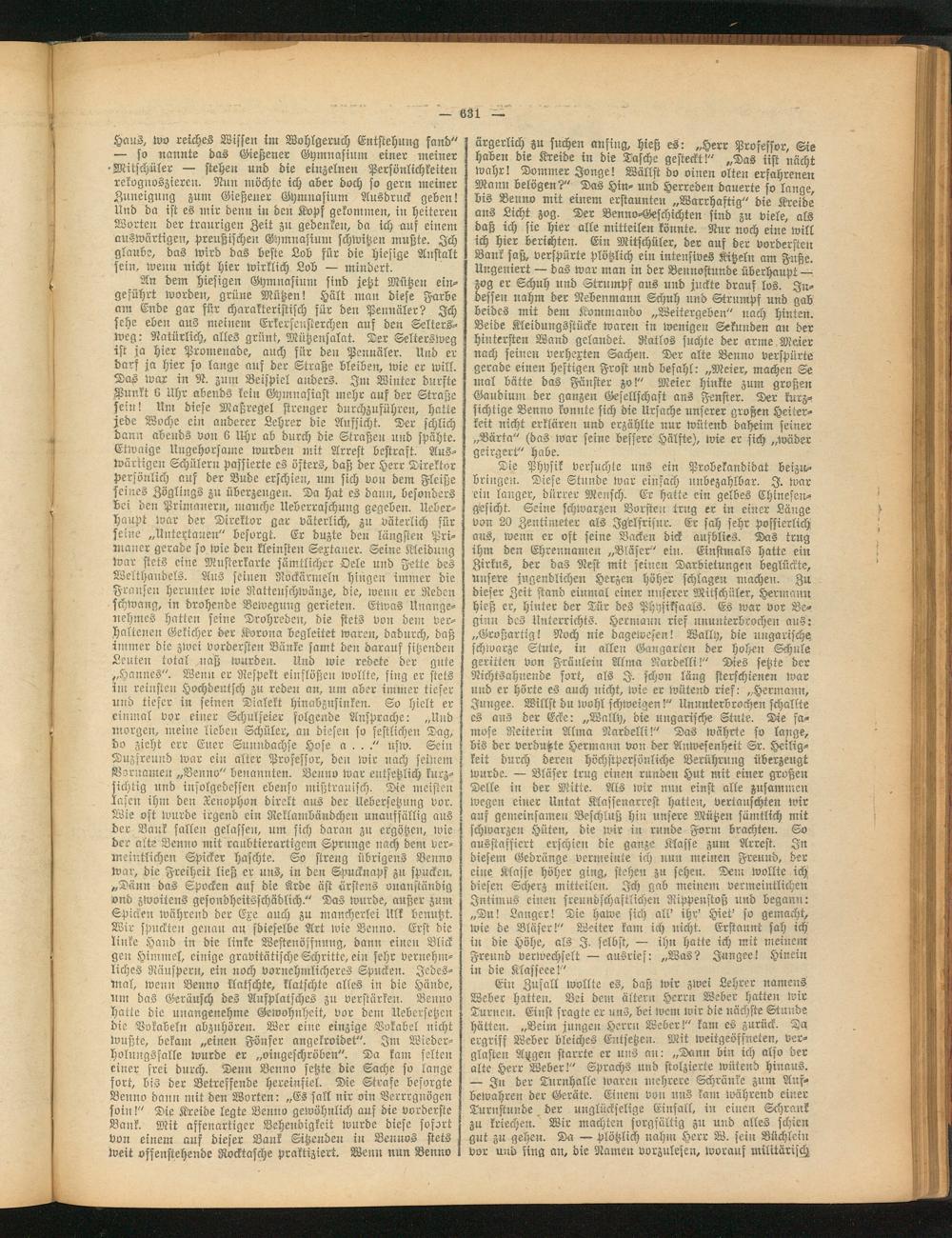 HauZ, wo reiches Wissen im Wohlgeruch Entstehung fand" — so nannte das Gießener Gymnasiuin einer meiner -Mitschüler — stehen und die einzelnen Persönlichkeiten rekognoszieren. Nun möchte ich aber doch so gern meiner Zuneigung zunk Gießener Gymnasium Ausdruck geben! Und da ist es mir denn in den Kopf gekommen, in heiteren Worten der traurigen Zeit zn gedenken, da ich aus einem auswärtigen, preußischen Gymnasium schwitzen mußte. Ich glaube, das wird das beste Lob für die hiesige Anstalt sein, wenn nicht hier wirklich Lob — mindert.