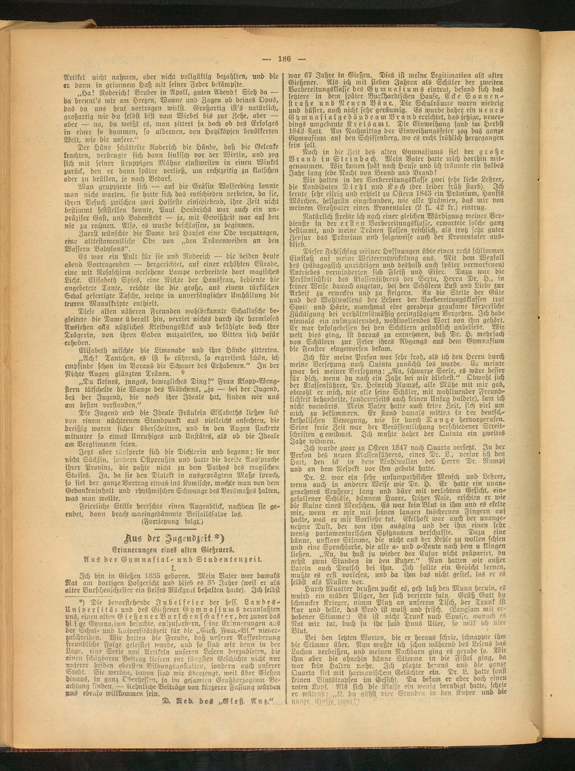 *) Die bevorstehende Jubelfeier der Hess. Landes- Universitär und des Gießener Gymnasiums veranlaßten uns, einen alten Gieße nerBurschenschafter, der zuvor das Hi.sge Gymnasium besuchte, aufzuford'rn, s ine Erinnerungen aus der Schul- und Universitätszeit für die „Gieß. Fam.-Bl." nieoer- Kuschreiben. Wir hatten die Freude, daß unserer Aufforderung freundliche Folge geleistet wurde, und so sind wir denn in der Lage, eine Serie von Artikeln unseren Lesern darzubieten, die einen schätzbaren Beitrag liefern zur jüngsten Geschichte nicht nur unserer beiden obersten Bildungsanstalten, sondern auch unserer Stadt. Sie werden, davon sind wir überzeugt, weit über Gießen hinaus, in ganz Oberhesfen, ja im gesamten Großherzogtnm Beachtung finden. — Aehnliche Beiträge von kürzerer Fassung würden Nns ebenso willkommen sein.