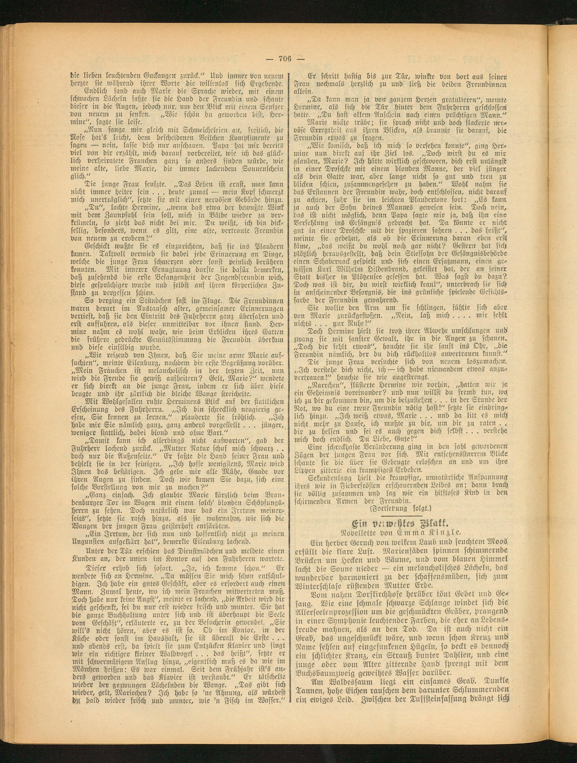 Endlich fand auch Marie die Sprache wieder, mit einem schwachen Lächeln faßte sie die Hand der Freundin rind schaute dieser in die Augen, jedoch mir, um den Blick mit einem Seufzer von neuem zu senken. „Wie schön dn geworden bist, Hermine", sagte sie leise.