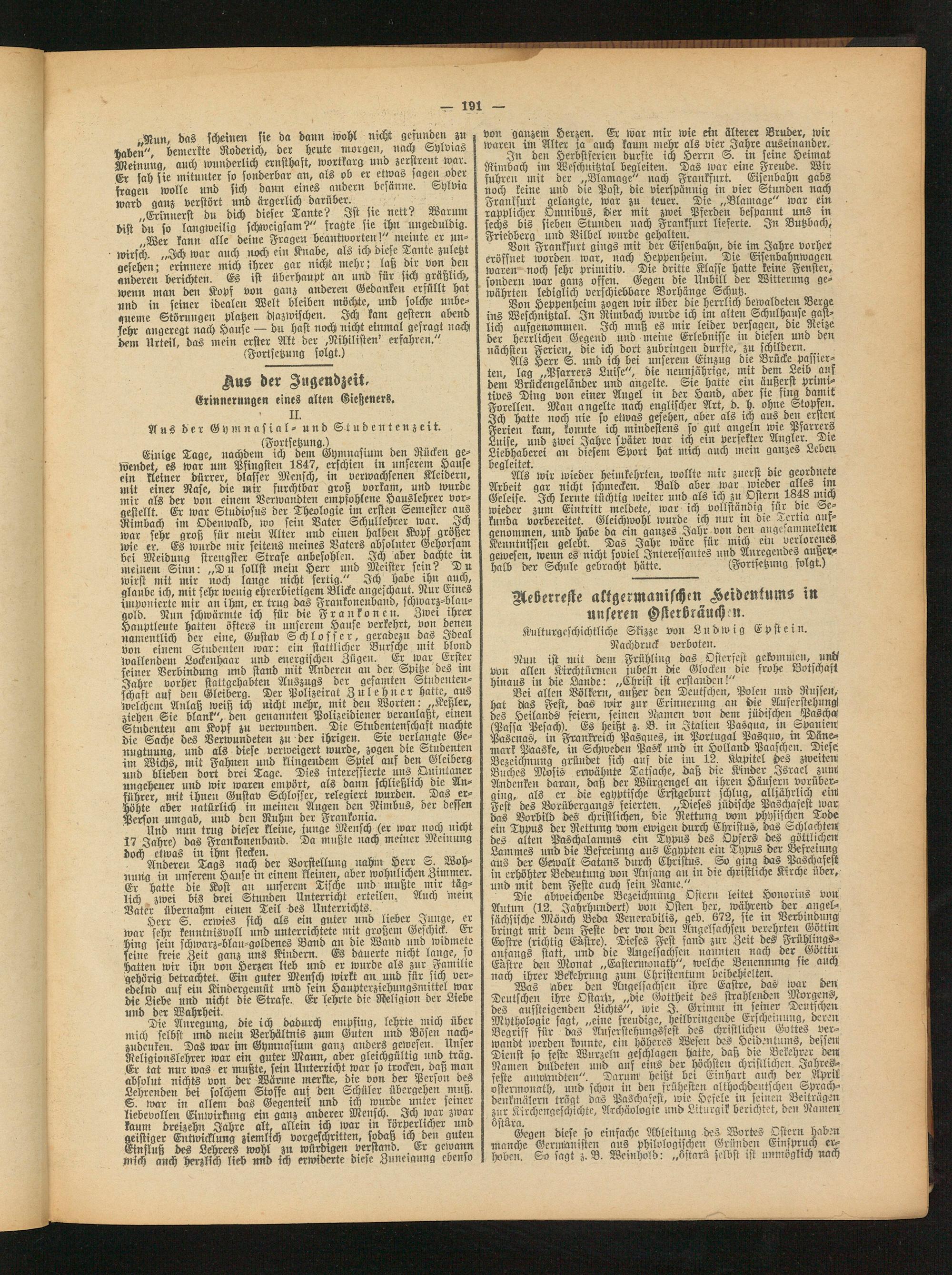 Herr S. erwies sich als ein guter unb lieber Junge, er war sehr kenutnisvoll und unterrichtete mit großem Geschick. Er hing sein fchwarz-blau-goldenes Band an die Wand und widmete seine freie Zeit ganz uns Kindern. Es dauerte nicht lange, so hatten wir ihn von Herzen lieb und er wurde als zur Familie gehörig betrachtet. Ein guter Mensch wirkt an und für sich veredelnd auf ein Kindergenlüt und sein Haupterziehungsmittel war die Liebe und nicht die Strafe. Er lehrte die Religion der Liebe