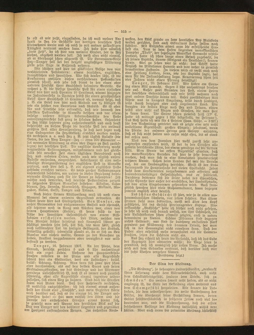 Nach dieser kleinen Abschweifung muß ich noch einen . Moment bei einem anderen Gegenstand verweilen. Er bildet heute hier das Stadtgespräch. Ben Man für, ein naher Berwandter des vielgenannten Raisuli und ehemals, als letzterer noch in Rang und Würden war, einer von seinen Hauptleuten (Kalifä), ist heute früh in der Nähe der spanischen Gesandtschaft von einem Riff- kabylen erschossen worden. Der Täter, welcher von Ben Mansur früher beleidigt und finanziell schwer geschädigt worden sein soll, hat sich, wie man hört, gleich nach vollbrachter Tat im hiesigen Gefängnis, der Kasbah, freiwillig gestellt; jedenfalls glaubt er, da er sich an Ben Mansur nur rächen wollte, Grund zu der Annahme zu haben, straffrei wegzukommen oder wenigstens nur mild bestraft zu werden.