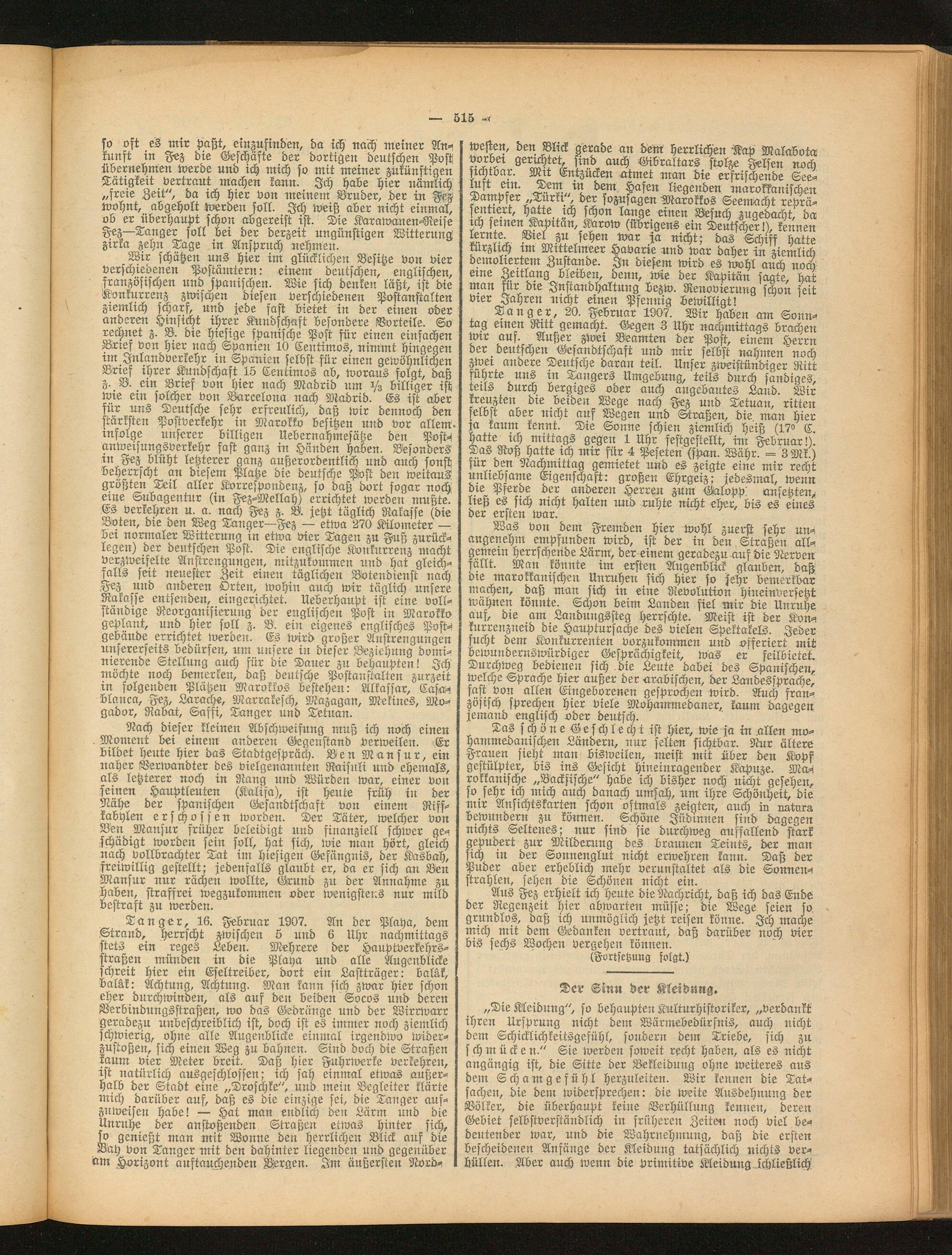 Tanger, 20. Februar 1907. Wir haben am Sonntag entert Ritt gemacht. Gegen 3 Uhr nachmittags brachen wer auf. Außer zwei Beamten der Post, einem Herrn der,deutschen Gesandtschaft und mir selbst nahmen"noch zwei andere Deutsche daran teil. Unser zweistündiger Ritt führte uns in Tangers Umgebung, teils durch sandiges, teils durch bergiges oder auch atigebautes Land. Wir kreuzten die beiden Wege nach Fez und Tetuan, ritten selbst aber nicht auf Wegen und Straßen, bis. man hier ja kaum kennt. Die Sonne schien ziemlich heiß (17° C. hatte ich mittags gegen 1 Uhr sestgestellt, im Februar!). Das Roß hatte ich mir für 4 Peseten (span. Währ. = 3 Mk.) für den Nachmittag gemietet und es zeigte eine mir recht unliebsame Eigenschaft: großen Ehrgeiz; jedesmal, wenn die Pferde der anderen Herren zum Galopp! ansetzten, ließ es sich nicht halten uttd ruhte nicht eher, bis es eines der ersten war.