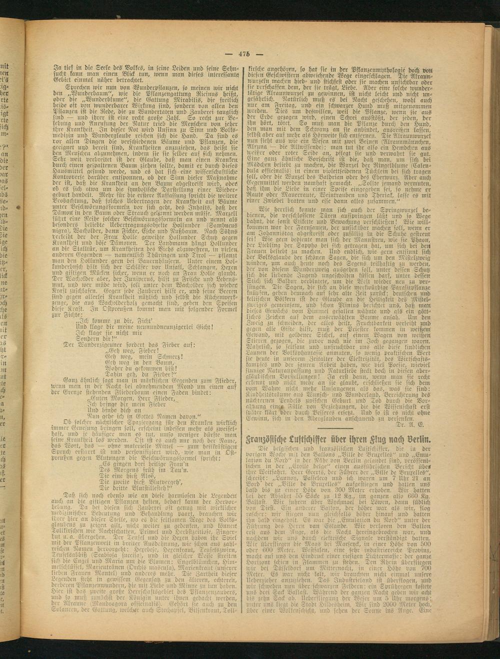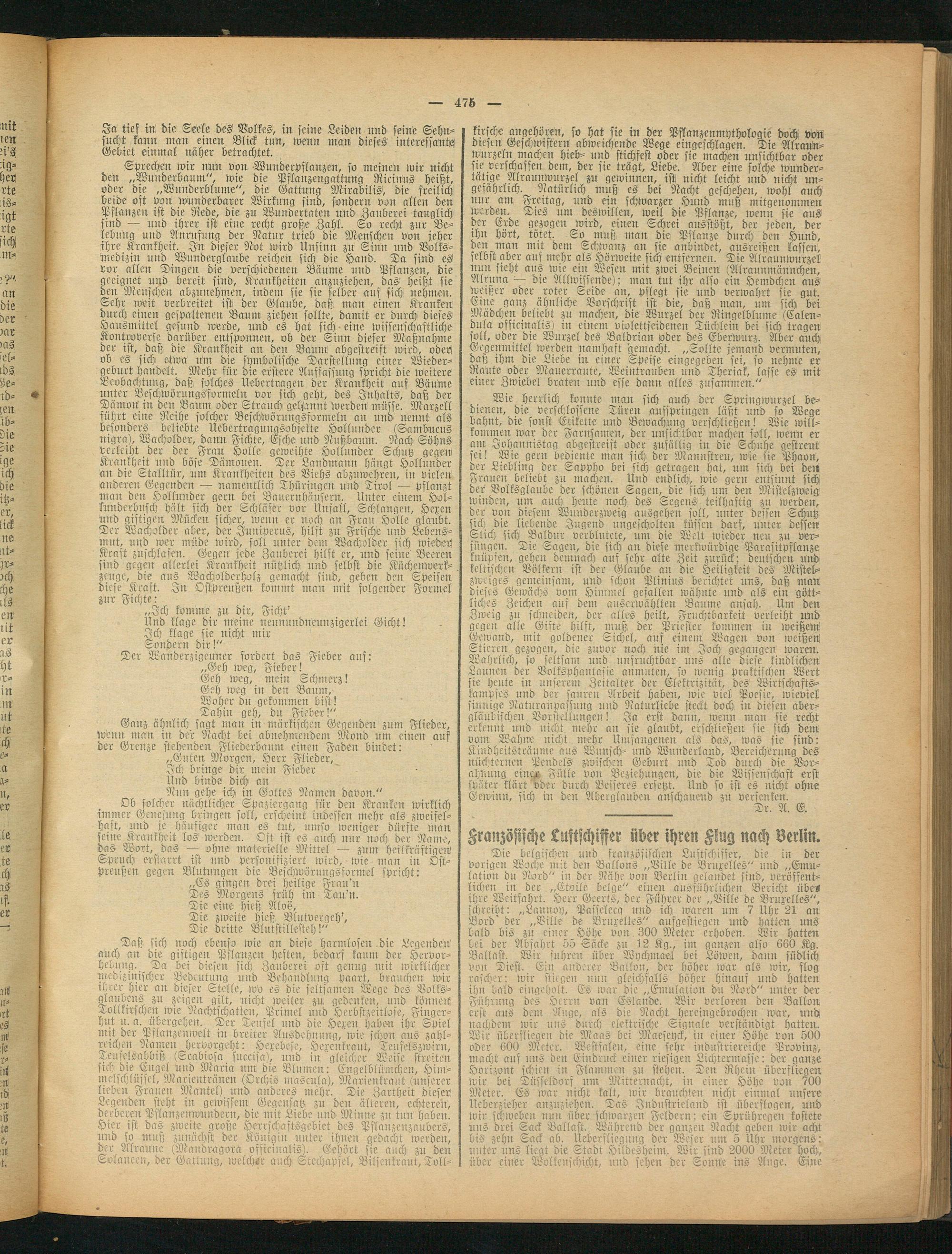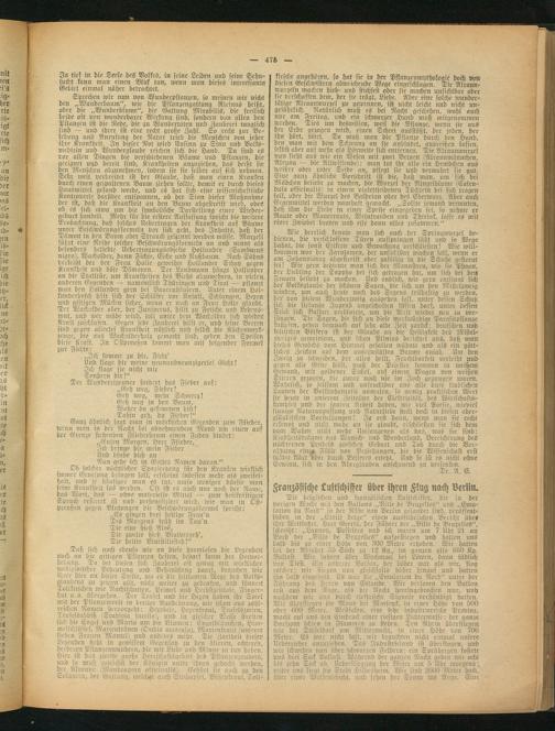 Die belgischen und französischen Lustschisser, die in der vorigen Woche mit den Ballons „Ville de Bruxelles" und „Emulation bu Nord" in der Nähe von Berlin gelandet sind, veröffentlichen in der „Etoiie Beige" einen ausführlichen Bericht übe« ihre Weitfahrt. Herr Geerts, der Führer der „Bille dc Bruxelles", schreibt: „Lannoy, Passcleeg und ich waren um 7 Uhr 21 an Bord' der „Ville de Bruxelles" aufgestiegen und hatten uns bald Bis zu einer Höhe von. 300 Meter erhoben. Wir hatten Lei der Abfahrt 55 Säcke zu 12 Kg., im ganzen also 660 Kg. Ballast. Wir fuhren über Wychmael bei Löwen, dann südlich von Diest. Ein anderer Ballon, der höher war als wir, flog rascher: wir stiegen nun gleichfalls höher hinauf und hatten ihn bald eingeholt. Es war die „Emulation du Nord" unter der Führung des Herrn van Eslande. Wir verloren den Ballon erst ans dein Äuge, als die Nacht hereingebrochen mar, und nachdem wir uns durch elektrische Signale verständigt hatten. Wir überfliegen die Maas bei Maescyck, in einer Höhe von 500 oder 600 Meter. Westfalen, eine sehr industriereiche Provinz, macht auf uns den Eindruck einer riesigen Lichtermasse: der ganze Horizont schien in Flammen zn stehen. Ten Rhein überfliegen wir bei Düsseldorf um Mitternacht, in einer Höhe von 700 Meter. Es war nicht kalt, wir brauchten nicht einmal unsere Ucberzieher anzuziehen. Tas Industrieland ist überflogen, und wir schweben nun über schwarzen Feldern: ein Sprühregen kostete uns drei Sack Ballast. Während der ganzen Nacht geben wir acht bis zehn Sack ab. Uebersliegung der Weser um 5 Uhr morgens: unter uns liegt die Stadt Hildesheim, Wir sind 2000 Meter hoch, über einer Wolkenschicht, nnd sehen der Sonne ins Auge. Eine