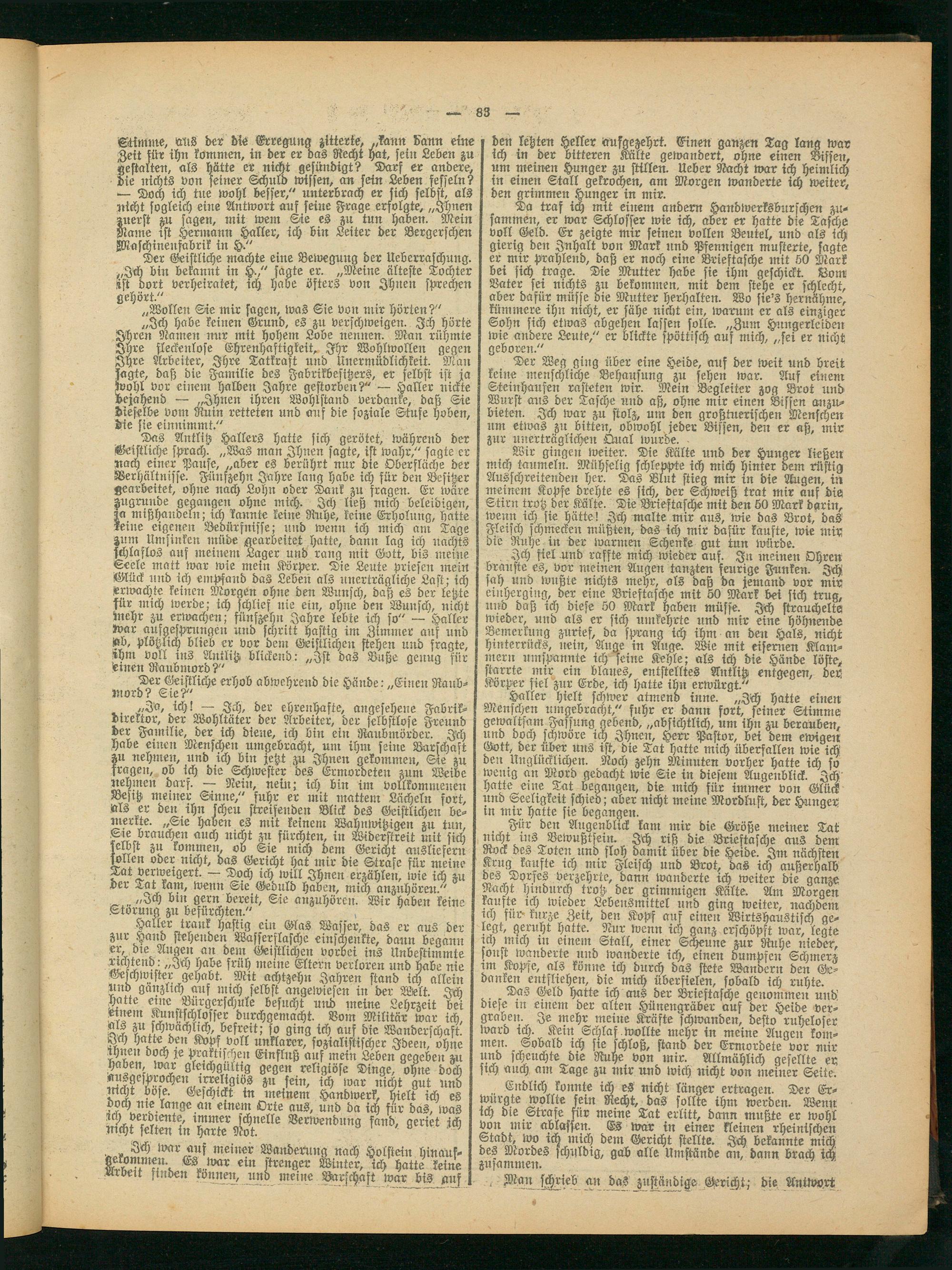 Haller hielt schwer atmend inne. „Ich hatte einen Menschen umgebracht," fuhr er dann fort, seiner Stimme gewaltsam Fassung gebend, „absichtlich, um ihn zu berauben, und doch schwöre ich Ihnen, Herr Pastor, bei dem ewigen Gott, der über uns ist, die Tat hatte mich überfallen wie ich den Nuglücklichen. Noch zehn Minuten vorher hatte ich so wenig an Word gedacht wie Sie in diesem Augenblick. Ich hatte eine Tat begangen, die mich für immer von Glück und Seeligkeit schied; aber nicht meine Mordlust, der Hunger in mir hatte sie begangen.