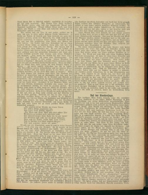 Der berühmte Bone Cabin Quarrtz, jener öde, menschen- vcrlafseiie Landstrich in-, den kahlen Wüsten Wyomings, in dem! die Forschung eine riesige Gräberstätte vorgeschichtlicher Tiere gefunden -hat und in der jetzt nach weiteren Knocheiiresten fossil er! Erdbewohner geschürft wird, verdankt ihre Entdeckung einem eigenartigen Zufall. Eine Anzahl von Gelehrten, die auf der Such« Nach allen Tierskeletten die berüchtigten Bad- Lands Amerikas durchstreifte^, stieß nach tagelanger Wanderung durch die Einöden auf eine kleine Hütte, die einst das Heim eine» Hirten gewesen und 'nun längst verlassen war. Diese menschliche Wohnstätte in so unwirtlicher Gegend, so erzählt D-ay Wen Wilkey in Chambers's Jäurnal, erregte die Neugier der Forscher; ein Teilnehmer der Expedition bemerkte, daß die Hütte nicht direkt aus der Erde errichtet w-av, sondern auf dunkelfarbigen natürlichen Stein- säulen zu ruhen schien. Das Land ist dort sandig und kahk, kaum, daß Man hin und- wieder einige kleine Kieselsteine findet, und daher erregten die Steine das Sitte reffe der Gelehrten. „Ich möchte wissen, wo der Mann die Steine herbe ko irtni-en hat", meinte Walter Grang-cr und -nachlässig stieß eil mit dem Fuße gegen eine dieser „Säulen", die jmit der Zeit sich etwas gelockert Hatten. Ein Rus der Ueberraschnng wurde laut, man beugte ttch näher über den Stein, untersuchte die dunkelsar-bige Substanz und dann kam die überraschende Feststellung: „Dieses kleine „StemWk" ist ein Knochenteil von einer der größten Kreaturen, die der Mensch kennt: es ist ein Fragment von einem Brou- tosaurus." Sofort begann inan an Ort und Stelle weitere Grä- billigen, und nach wenigen Stunden stieß man bereits auf einen! gewaltigen mannsgroßäl Knochen, der ein weiteres Teil von jenem riesigen Boontvsaurusfkclette bildete, das Heute eines dep merkwürdigsten Schaustücke des Rcwyorkev Naturhistorischen Museums bildet. ‘Ser überraschende Fund lenkte naturgemäß mit einem Schlage die Aufuierffanikcit der Naturforscher auf jenen Neck Erde, der bis dahin nur selten von einsame» Gelehrten besucht Wurde. @r erwies sich als eine riesige Totenka m m er vorgeschichtlicher Tiergeschlcchtcr, und in großem Maßstab ist nun mit -der systematischen Durchsuchung der Gegend begonnen worben. Ter Boden wurde in kleine Abschnitte geteilt, die Stück um Stück durchforscht wurden, und nach sechsjähriger Arbeit mit Schaufel und Spaten war ein Gebiet von 7500 Quadratfuß abgesucht. Aber dieses kleine Stück Land ergab schon überraschend reiche Funde; nicht weniger als 73 verschiedene Tierskelette wurden der Forschung gesichert, von denen 44 den Dinosaurierfamilig angchören. Seitdem sind die einst verrufenen „Bad Lands" zu einer wahren Schatzkammer für- die „Knochenjäger" geworden, schon Vorher waren in jener Gegend- einzelne Funde gemacht it-orb-en, Skelette von Elcsantcn, Tiger n und Kanie len, die viel späteren Epochen angehörten, als die zuletzt gefundenen Saurier. Sie haben gelehrt, daß vor Zehntansenden von Jahren riesige Kamele durch das südwestliche Amerika waiidevten, Tiere/