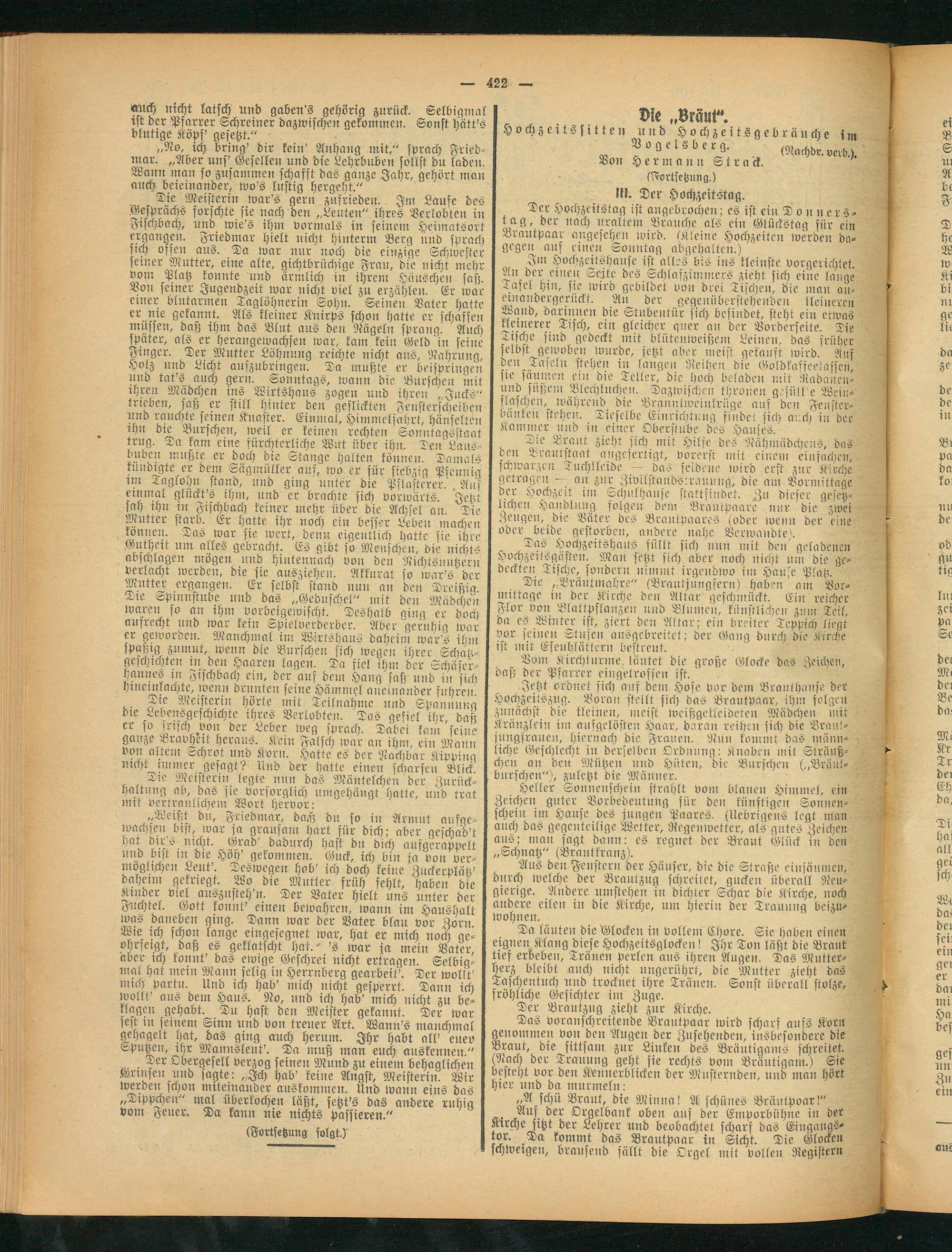 Da läuten die Glocken in vollem Chore. Sic haben einen eignen Klang diese Hochzeitsglockei,! Ihr Ton läßt die Brant tief erbeben, Tränen perlen ans ihren Augen. Das Mutterherz bleibt auch nicht ungerührt, die Mutter zieht das Taschentuch und trocknet ihre Tränen. Sonst überall stolze, fröhliche Gesichter im Zuge.