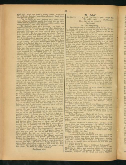 I Der Hochzeitstag ist angebrochen; es ist ein Donners- I lag, der nach uraltem Brauche als ein Glückstag für ein I Brautpaar angesehen wird. (Kleine Hochzeiten werden da- I gegen auf einen Sonntag abgehalten.)