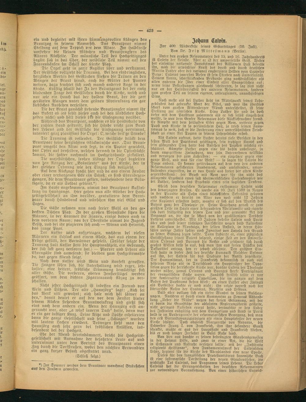 Unter den großen Reformatoren des 15. und 16. Jahrhunderts ist Calvin der kleinste. Aber er ist der universellste Geist. Weder der einseitige nationale Fanatismus des Allslawen Huß beseelte ihn, noch die urwüchsige Kraft des durch und durch deutschen Martin Luther oder des national engherzigen Helden vom Cappeler Berge: Calvins innerstes Wesen ist sein Streben nach Universalität. Seinem klaren, scharfblickenden Verstände ging nachdrücklicher als allen anderen die Idee einer Einheit aller Evangelischen ans; wenn seine Bestrebungen gleichwohl scheiterten, so lag dies nicht nur an der Halsstarrigkeit der anderen Reformatoren, sondern zum großen Teil ail seinem eigenen, unbeugsamen, unnachgiebigen Sinn.