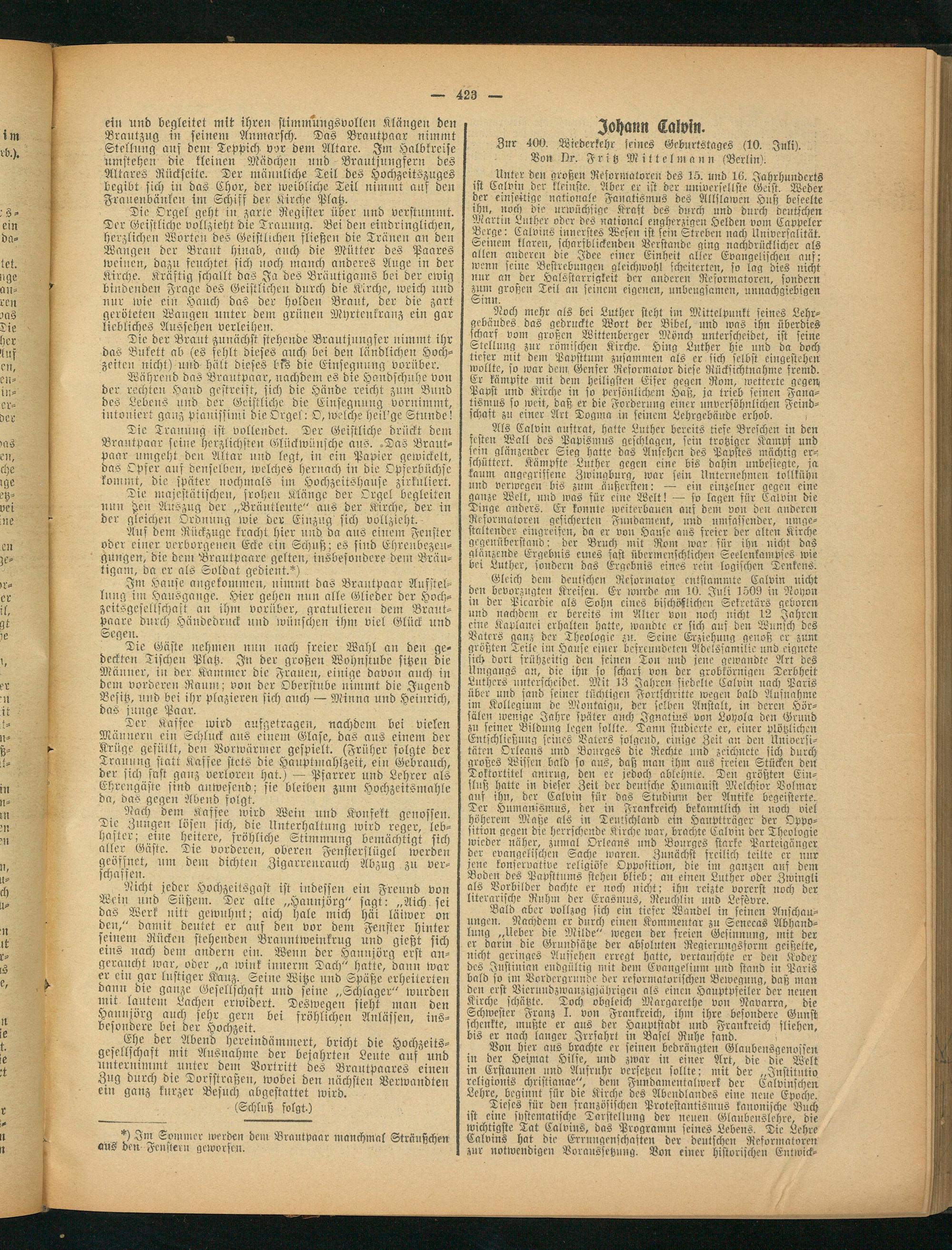 Der Kaffee wird aufgetragen, nachdem bei vielen Männern ein Schluck ans einem Glase, das aus einem der Krüge gefüllt, den Borwärmer gespielt. (Früher folgte der Trauung statt Kaffee stets die Hauptmahlzeit, ein Gebrauch, der sich fast ganz verloren hat.) — Pfarrer und Lehrer als Ehrengäste sind anwesend; sie bleiben zum Hochzeitsmahle da, das gegen Abend folgt.