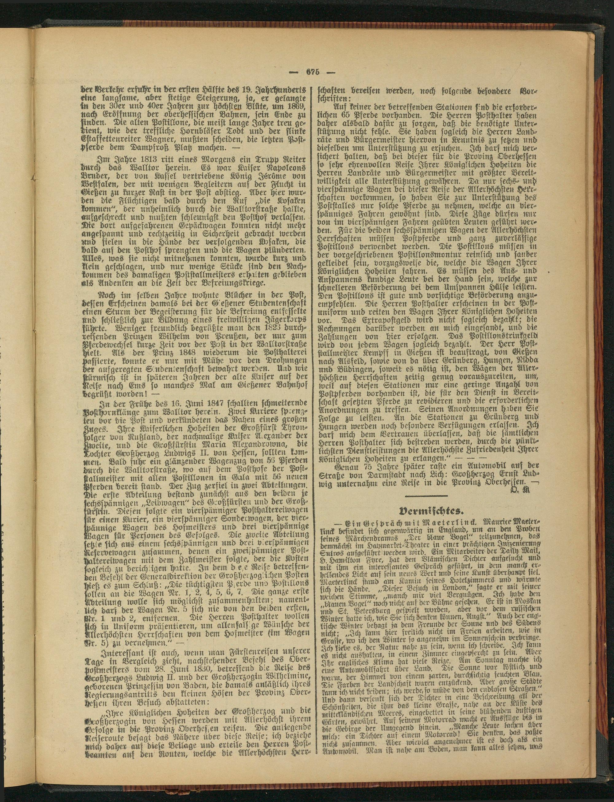 Interessant ist auch, wenn man Fürstenreisen miserer Tage in Bergleich zieht, nachstehender Befehl des Oberpostmeisters vom 28. Juni 1830, betreffend die Reise des Großherzogs Ludwig II. und der Großherzogin Wilhelmine, aeborenen Prinzessin von Baden, die damals anläßlich ihres Regierungsantritts den kleinen Höfen der Provinz Ober- tzesten ihren Besuch abstatteten: