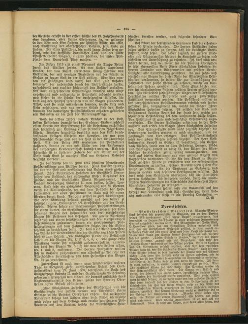 Auf keiner der betreffenden Stationen tznd die erforderlichen 65 Pferde vorhanden. Die Herren Posthalter haben daher alsbald dafür zu sorgen, daß die benötigte Unterstützung nicht fehle. Sie haben sogleich die Herren Landräte und Bürgermeister hiervon in Kenntnis zu setzen und dieselben um Unterstützung zu ersuchen. Ich darf mich versichert halten, daß bei dieser für die Provinz Oberhessen so sehr ehrenvollen Reise Ihrer Königlichen Hoheiten die Herren Landräte und Bürgermeister mit größter Bereit- lvilligkeit alle Unterstützung gewähren. Da nur sechs- uich vierspännige Wagen bei dieser Reise der Allerhöchsten Herrschaften Vorkommen, so haben Sre zur Unterstützung des Poststalles nur solche Pferde zu nehmen, welche au vierspänniges Fahren gewöhnt sind. Diese Züge dürfen nur von im vierspännigen Fahren geübten Leuten geführt tott- deu. Für die beiden sechsspännigen Wagen der Allerhöchsten Herrschaften müssen Postpferde und ganz zuverlässige Postillons verivendet werden. Die Postillons müssen in der vorgeschriebenen Postillonsmontur reinlich und sauber gekleidet fern, vorzugsweise die, welche die Wagen Ihrer Königlichen Hoheiten fahren. Es müssen des Aus- und . Anspannens kundige Leute bei der Hand sein, welche zur schnelleren Beförderung bei dem Umspannen Hülfe leisten. Den Postillons ist gute und vorsichtige Beförderung anzuempfehlen. Die Herren Posthalter erscheinen in der Postuniform und reiten den Wagen Ihrer Königlichen Hoheiten vor. Das Extrapostgeld wird nicht sogleich bezahlt; die Rechnungen darüber werden an mich eingesandt, und die Zahlungen von hier erfolgen. Das Postillonstrinteeldi wird von jedem Wagen sogleich bezahlt. Der Herr Post- stallmeiister Kempff in Gießen ist beauftragt, von Gießen nach Alsfeld, sotvie von da über Grünberg, Hungen, Nidda und Büdingen, soweit es nötig ist, den Wägen der Allerhöchsten Herrschaften zeitig genug vorauszureiten, UM, weil auf diesen Stationen nur eine geringe Anzahl von Postpserden vorhanden ist, die für den Dienst in Bereitschaft gesetzten Pferde zu revidieren und die erforderlichen Anordnungen zu treffen. Seinen Anordnungen haben Sie Folge zu leisten. An die Stationen zu Grünberg und Hungen werden noch besondere Verfügungen erlassen. Ich darf mich dem Vertrauen überlassen, daß die sämtlichen Herren Posthalter sich bestreben werden, durch die pünktlichsten Dienstleistungen die Allerhöchste Zufriedenheit Ihrer Wniglichen .Hoheiten zu erlangen."---