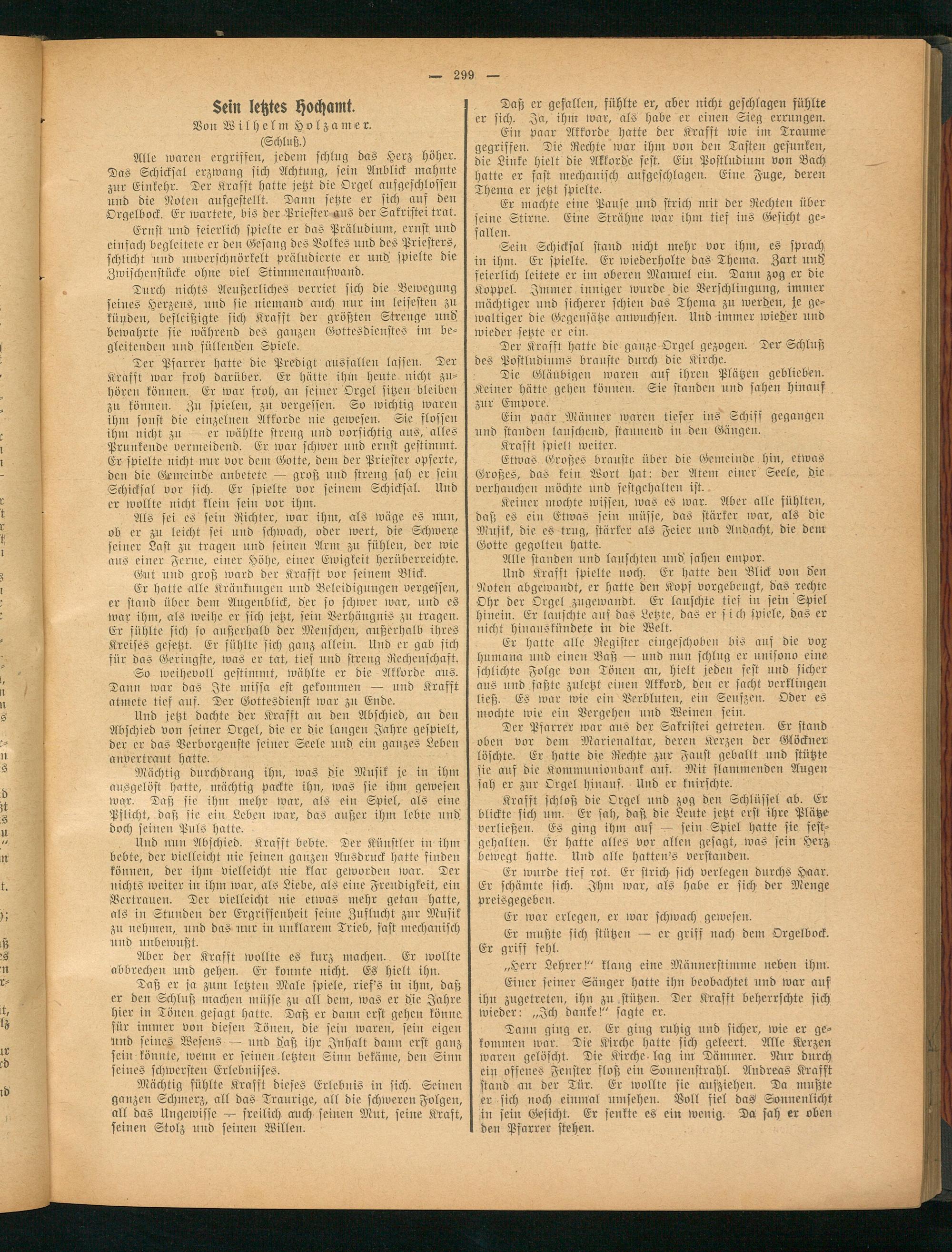 Und jetzt dachte der Krafft au den Abschied, an den Abschied von seiner Orgel, die er die langen Jahre gespielt, der er das Verborgenste seiner Seele und ein ganzes Leben anvertraut hatte.