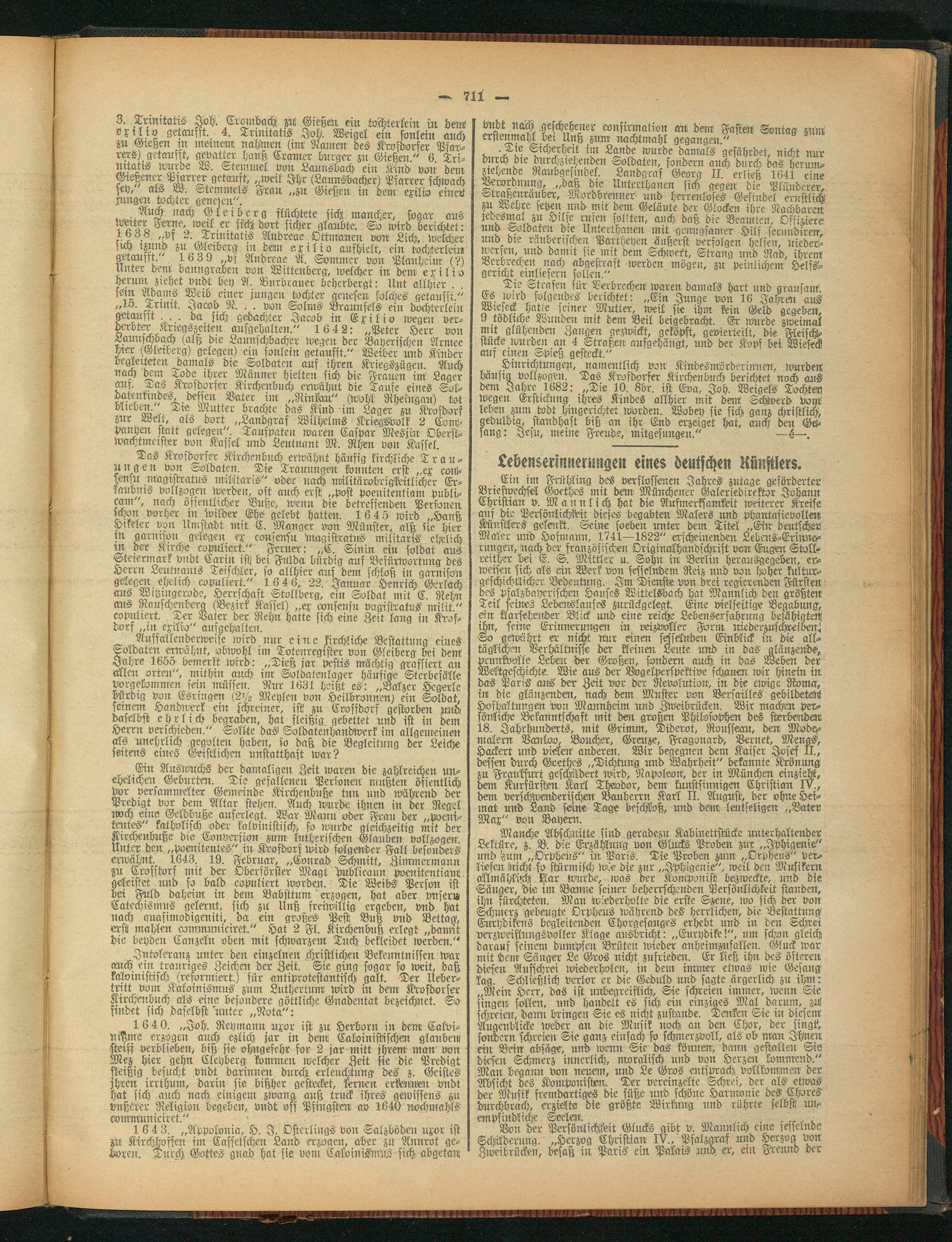 , Ein im Frühling des verflossenen Jahres' zutage geförderter Briefwechsel Goethes mit dem Münchener Galeriedirektor Johann Christian v. Männlich hat die Aufmerksamkeit weiterer Kreise auf die Persönlichkeit dieses begabten Malers und phantasievollen Künstlers gelenkt. Seine soeben unter dem Titel ,,®in deutscher! Maler und Hofmann, 1741—1822" erscheinenden Lebens-Erinne^ rungen, nach der französischen Originalhandschrift von Eugen Stall- reither bei E. S. Mittler u. Sohu in Berlin herausgegeben, erweisen sich als ein Werk von fesselndem Reiz und von hoher kulturgeschichtlicher Bedeutung. Im Dienste von drei regierenden Fürsten des pfalzbayerischen Hauses Wittelsbach hat Männlich den größten Teil seines Lebenslaufes zurückgelegt. Eine vielseitige Begabung, eilt klarsehender Blick und eine reiche Lebenserfahrung befähigtest ihn, feine Erinnerungen in reizvoller Form niederzuschreibenj So gewährt er nicht UNr einen fesselnden Einblick tn die alltäglichen Verhältnisse der kleinen Leute und in das glänzende, prunkvollo Leben der Großen, sondern auch in das Weben der Weltgeschichte. Wie aus der Vogelperspektive schauen wir hinein in das Paris aus der Zeit vor der Revolution, in die ewige Roma, in die glänzenden, nach dem Muster von Versailles gebildeten Hofhaltungen von Mannheim und Zweibrücken. Wir machen persönliche Bekanntschaft mit den großen Philosophen des sterbenden 18. Jahrhunderts, mit Grimm, Diderot, Rousseau, den Mode? malern Vanloo, Boucher, Grenze, Fragonard, Bernet, Menas, Hackert und vielen' anderen. Wir begegnen dem Kaiser Josef II., dessen durch Goethes „Dichtung und Wahrheit" bekannte Krönung zu Frankfurt geschildert wird, Napoleon', der in München einzieht, dem Kurfürsten Karl Theodor, dem kunstsinnigen Christian IV., dem verschwenderischen Bauherrn Karl II. August, der ohne Hei- mat und Sa,nb feine Tage bescWoß, und dem leutseligen „Vater Max" von Bayern.