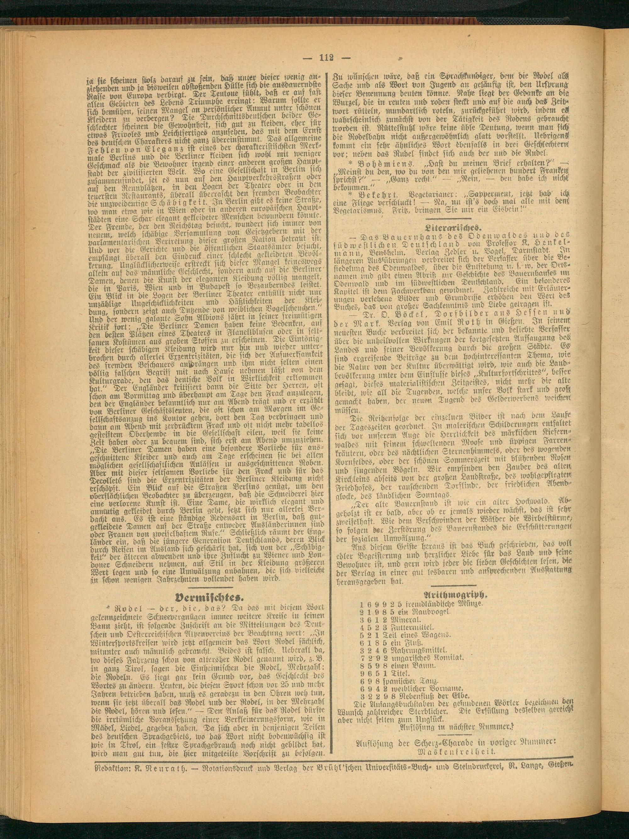 Redaktion: K. Neurath. — NotasionSdruck und Verlag der Brühl'fchen Universitäts-Buch- und Steindruechrei, R. Lange, Gießen-