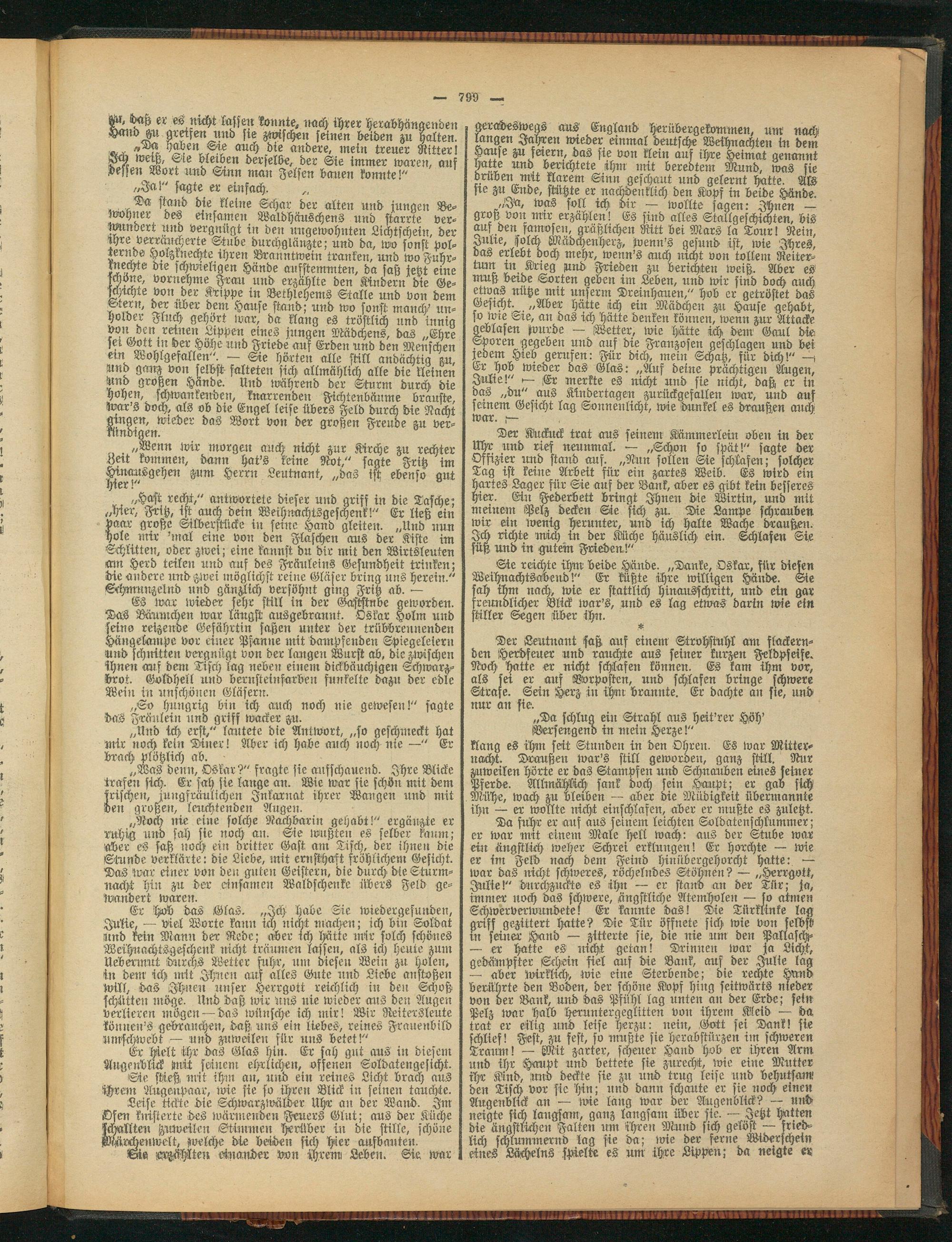 „Hast recht," antwortete dieser und griff in die Tasche; „hier, Fritz, ist auch dein Weihnachtsgeschenk!" Er ließ ein paar große Silberstücke in seine Hand gleiten. „Und nun hole mir 'mal eine von den Flaschen aus der Kiste im Schlitten, oder zwei; eine kannst du dir mit den Wirtsleuten am Herd teilen und auf des Fräuleins Gesundheit trinken; die andere und zwei möglichst reine Gläser bring uns herein." Schmunzelnd und gänzlich versöhnt ging Fritz ab. —