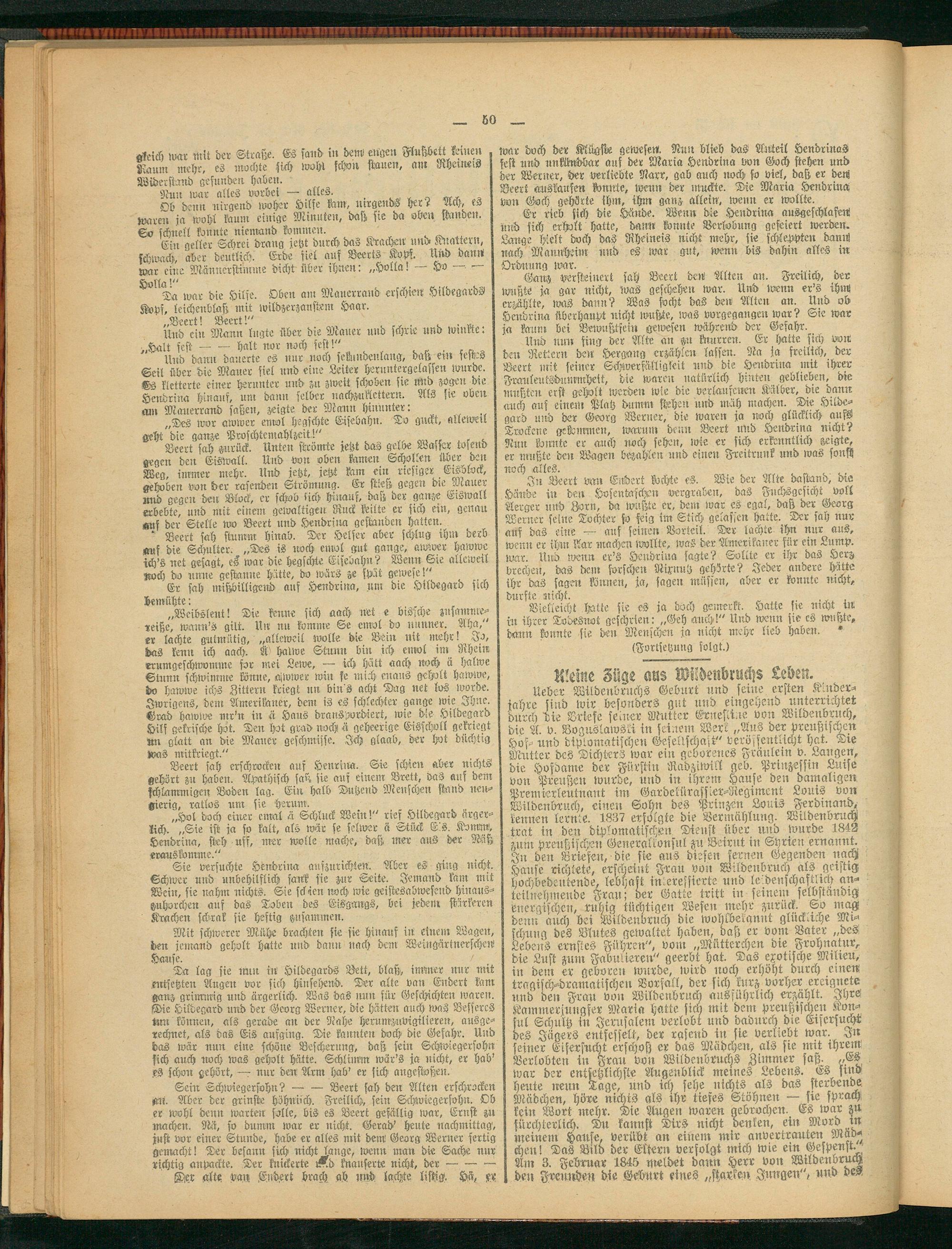 Heber Wildenbruchs Geburt und feine ersten Kinderjahre sind wir besonders gut und eingehend unterrrcytet durch hie Briefe seiner Mutter Ernestine von Wildenbruch, die A. v. Boguslawski in seinem Wert „Aus der preußischen Hof- und diplomatischen Gesellschaft" veröffentlicht hat. Die Mutter des Dichters war ein geborenes Fräulein v. Langen, die Hofdame der Fürstin Radziwill geb. Prinzessin Luise voil Preußen tourbe, und in ihrem Hause den damaligen Premierleutnant im GardekürassierMegiment Louis von Wildenbruch, einen Sohn des Prinzen Louis Ferdinand, kennen lernte. 1837 erfolgte die Vermählung. Wildeubruch trat in den diplomatischen Dienst über und wurde 1842 zum preußischen Generalkonsul zu Betritt in Syrien ernannt. In den Briefen, die sie aus diesen fernen Gegenden nach Hause richtete, erscheint Frau von Wildeubruch als geistig! hochbedeilteude, lebhaft interessierte und leidenschaftlich an- teilnehmende Frau; der Gatte tritt in seinem selbständig energischen, ruhig tüchtigen Weseii mehr zurück. So mag denn auch bei Wildenbruch die wohlbekannt glückliche Mt- schuiig des Blutes geivaltet haben, daß er vom Vater „des Lebens ernstes Führen", vom „Mütterchen die Frohnatur, die Lust zum Fabulieren" geerbt hat. Das exotische Milteu, in dem er geboren wurde, wird noch erhöht durch einen tragisch-dramatischen Vorfall, der sich kurz vorher ereignete und den Frau von Wildeubruch ausführlich erzählt. Ihre Kammerjungfer Maria hatte sich mit dem preußischen Konsul Schultz in Jerusalem verlobt und dadurch die Eifersucht des Jägers entfesselt, der rasend in sie verliebt war. x;it seiner Eifersucht erschoß er das Mädchen, als sie mit ihrem Verlobten in Frau von Wildeubruchs Zimmer saß. „Es war der entsetzlichste Augenblick meines Lebens. Es find heute neun Tage, und ich sehe nichts als das sterbens Mädchen, höre nichts als ihr tiefes Stöhnen — sie sprach kein Wort mehr. Die Augen waren gebrochen. Es war zu fürchterlich. Du kaunst Dirs nicht denken, ein Mord m meinem Haufe, verübt an einem mir anvertrauten Mädchen! Das Bild der Eltern verfolgt mich wie ein Gespenst. Am 3. Februar 1845 meldet dann Herr von Wildeuoruch den Fremchen die Geburt eines „starken Jungen", und des