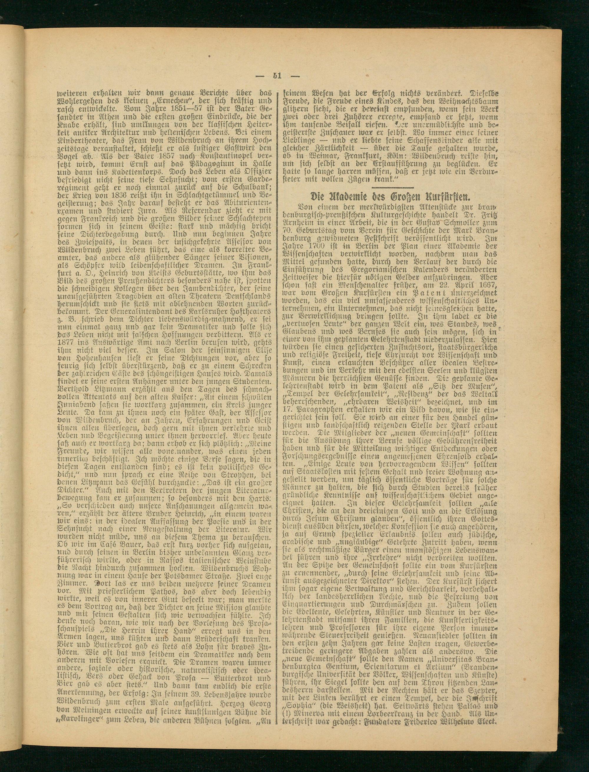 Von einem der merkwürdigsten Aktenstücke zur brau» denburgisch-preußischen Kulturgeschichte handelt Dr. Fritz Arnheim in einer Arbeit, die in oer Gustav Schmoller zum 70. Geburtstag vom Verein für Geschichte der Mark Brandenburg gewidmeten Festschrift veröffentlicht wird. Im Jahre 1700 ist in Berlin der Plan einer Akademie der Wissenschaften verwirklicht worden, nachdem man das Mittel gefunden hatte, durch den Verkauf der durch die Einführung des Gregoriamschen Kalenders veränderten Zeitweiser die hierfür nötigen Gelder anfzubringen. Aber schon fast ein Menschenalter früher, am 22. April 1667, war vom Großen Kurfürsten ein Patent ünterzeichnet worden, das ein viel umfassenderes wissenschaftliches Unternehmen, ein Unternehmen, das nicht seinesgleichen hatte, zur Verwirklichung bringen sollte. In ihm ladet er die „vertuosen Leute" der ganzen Welt ein, wes Standes, wes, Glaubens und wes Berufes sie auch sein mögen, sich in einer von ihm geplanten Gelehrtenstadt niederzulassen. Hier würden sie einen gekicherten Zufluchtsort, staatsbürgerliche und religiöse Freiheit, tiefe Ehrfurcht vor Wissenschaft und Kunst, einen erlauchten Beschützer aller idealen Bestrebungen und im Verkehr mit den edelsten Seelen und klügsten Männern die herrlichsten Genüsse finden. Die geplante Gelehrtenstadt wird in dem Patent als „Sitz der Musen", „Tempel der Gelehrsamkeit", „Residenz" der das Weltall beherrschenden, „ehrbaren Weisheit" bezeichnet, und im 17. Paragraphen erhalten wir ein Bild davon, wie sie eingerichtet sein soll. Sie wird an einer für den Handel günstigen uno landschaftlich reizenden Stelle der Mark erbaut werden. Die Mitglieder der „neuen Gemeinschaft" sollten für die Ausübung ihrer Berufe völlige Gebührenfreiheit haben und für die Mitteilung wichtiger Entdeckungen oder Forschungsergebnisse einen angemessenen Ehrensold erhalten. „Einige Leute von hervorragendem Wissen" sollten auf Staatskosten mit festem Gehalt und freier Wohnung an- gestellt werden, nm täglich öffentliche Vorträge für solche Männer zu halten, die sich durch Studien bereits früher gründliche Kenntnisse auf wissenschaftlichem Gebiet angeeignet hatten. In dieser Gelehrsamkeit sollten „alle Christen, die an den dreieinigen Gott und an die Erlösung durch Jesum Christum glauben", öffentlich ihren Gottesdienst ausübeit dürfen, welcher Konfession sie auch angehören, ja auf Grund spezieller Erlaubnis sollen auch jüdische, arabische und „ungläubige" Gelehrte Zutritt haben, wenn sie als rechtmäßige Bürger einen unanstößigen Lebenswandel führen und ihre „Irrlehre" nicht verbreiten wollten. An der Spitze der Genteinschaft sollte ein vom Kurfürsten zu ernennender, „durch seine Gelehrsamkeit und seine Abkunft ausgezeichneter Direktor" stehen. Der Kurfürst sichert ihm sogar eigene Berwaltrmg und Gerichtbarkeit, vorbehaltlich der landesherrlichen Rechte, und die Befreiung von Einquartierungen und Durchmärschen zu. Zndenr sollen die Edelleute, Gelehrten, Künstler und Rentner in der Gelehrtenstadt mitsamt ihren Familien, die Kunstfertigkeits- lehren und Professoren für ihre eigene Person immerwährende Steuerfreiheit genießen. Neuansiedler sollten in den ersten zehn Jahren gar keine Lasten tragen, Gewerbetreibende geringere Abgaben zahlen als anderswo. Die „neue Gemeinschaft" sollte den Namen „Universitas Bran- denbnrgica Gentium, Scienliarum et Artium" (Brandenburgische Universität der Völker, Wissenschaften und Künste) führen, ihr Siegel sollte den auf dem Thron sitzenden Landesherrn darstellen. Mit der Rechten hält er das Szepter, mit der Linken berührt er einen Tempel, der die Inschrift „Sophia" (die Weisheit) hat. Seitwärts stehen Pallas und (!) Minerva mit einem Lorbeerkranz in der Hand. Als Unterschrift war gedacht: Fuudqtore Friderico Wilhelm» Eleet.