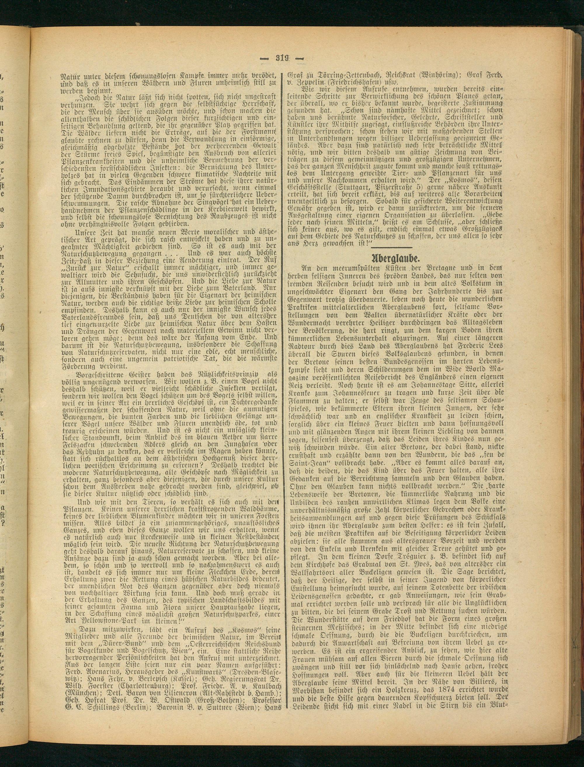 Dazu mitzuwirken, lädt ein Aufruf des „Kosmos" seine Mitglieder und alle Freunde der heimischen Natur, int Bereist mit dem „Dürer-Bund" und dem „Oesterreichischen Reichsbund für Vogelkunde und Vogelschutz, Wien", ein. Eine stattliche Reihe hervorragender Persönlichkeiten hat den Aufruf mit unterzeichnet. Aus der langen Liste seien nur ein paar Namen aufgeführt: Ferd. Avenarius, Herausgeber des „Kunstworts" (Dresdeu-Blase- witz); Hans Frhr. v. Berlepsch (Kassel); Geh. Regierungsrat Dr. Wilh. Foerster (Charlvttenburg); Prof. Friede. A. v. Kaulbach (München); Detl. Baron von Liliencron (Alt-Rahlstedt b. Hamb.); Geh. Hofrat Pros. Dr. W. Ostwald (Groß-Bothen); Professov G. C. Schillings (Berlin) ; Baronin B. v. Suttner (Wien);- Hans