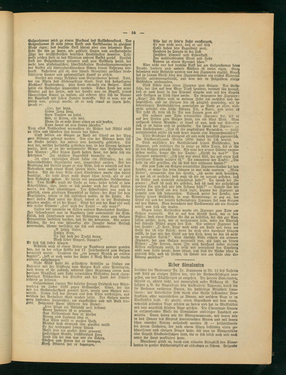Also hat er sein'n Lohn empfangen. Er war nicht wert, daß er aus Erd Sollt haben fein Begräbnis wert. Sondern da hangen in der Lust Zwischen Himmel und Erdenkluft. Zur wohlverdienten Straf und Lohn Andern zu einem Exempel schon." Aber nicht nur das deutsche Volk hat am Galgenhumor feine Freude, sondern auch andern Völkern ist dieser eigen. Ganz besonders viele Beispiele werden von den Zigeunern erzählt. Krauß hat in seinem Werke über den Zigeunerhumor ein reiches Material hierfür zusammengebracht, aus dem wir in Folgendem einige Geschichten wiedergeben.