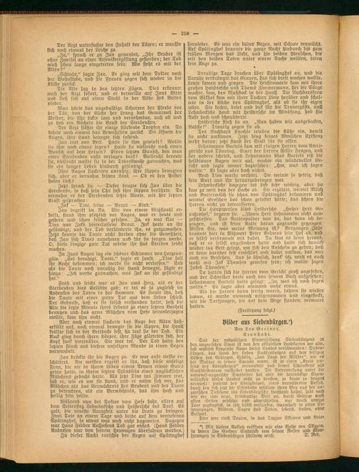 Seit der endgültigen Einverleibung Siebenbürgens irt den ungarischen Staat ist von den offiziellen Landkarten der alte, fast mystisch klingende Name dieses Landes verschwunden: Siebenbürgen, das Land der sieben Sachsenburgen auf den felsigen! Höhen des Gebirges, Erdsly, „das Land der Wälder", wie es der Madjar in seiner Sprache nennt, ist in einen „Kreis jenseits des Königsteiges" verwandelt und seines Charakters' als Großfürstentum entkleidet worden. Die Unterwerfung unter die national-ungarische Staatsidee hat aber die hartnäckige Eigen? willigkeit dieses Landes nicht zu brechen, ja kaum' zu beugen! vermocht: jenseits des Königsteiges, eines verwilderten Passes, durch den sich jetzt die Eisenbahn mühsam ihren Weg aus der ungarischen Tiefebene ins siebenbürgische Hochland bahnt, hebt nach wie vor eine neue, fremdartige Welt an, durch Gebirge nach allen Seiten geschützt und abgeschlossen, nur durch wenige Tore zugänglich, in sich selbst versunken, traumhaft in alten' Erinnerungen, Bildern, Sagen ünd Sitten, lebend, finster, ohne Beispiel.