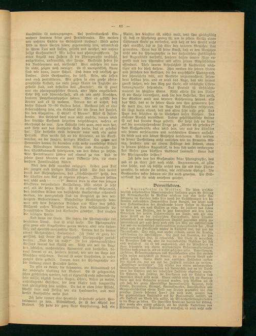 Und dann die Leute. Die sagen, die Photographie tut denselben Dienst. Das ist nicht wahr. Die Photographie gmi zwar alle Einzelheiten genau wieder, aber rein äußer- irch, auf chemisch-mechanische Weise. Darum hat sie immer ktwas Mechanisches, Seelenloses. Ich • finde es • ganz (>;•■ Kreislich, daß Leute die gelungenste Photographie zurück- wetfen: „Das bin ich nicht!" In den photographischen Ateliers kommt das täglich vor. Nicht w-ie wir im Auae des^ leblosen, mechanischen Apparates uns darftellen, da- raus kommt es an, sondern darauf, wie wir im Auge des -Nenschen erscheinen. Darauf ist unser Empfinden, ja unser ganzes Sein gestellt. Darum kann die Photographie nie die Geltung eines Porträts haben.