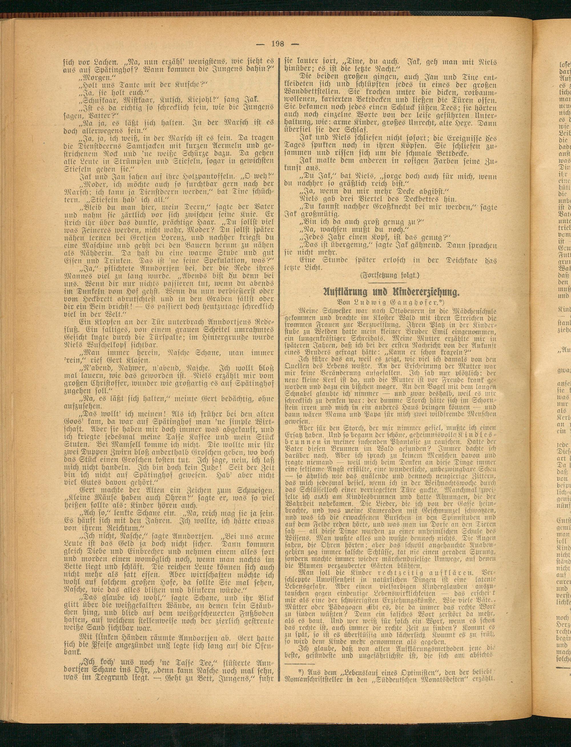Aber für den Storch, der mir nimmer gefiel, mußte ich einen Ersatz haben. Und so begann der schöne, geheimuisvollei Kindles - brunnen in meiner suchenden Phantasie zu rauschen. Hätte ber Baier diesen Brunnen int Wald gesunden? Immer dachte ich darüber nach. Aber ich sprach zu keinem Menschen davon und fragte niemand — weil mich beim Denken an diese Dinge immer eine, seltsame Angst erfüllte, eine wunderliche, unbezwingbare Scheu —- so ähnlich wie das quälende und dennoch neugierige Zittern, das mich jedesmal befiel, wenn ich in der Weihnachtswoche durch das Schlüsselloch einer verriegelten Türe guckte. Manchmal zweifelte ich awch am Kindlesbrunnen und hatte Ahnungen, die ber Wahrheit na bekamen. Die Lieder, die ich von der Gasse heimbrachte, und was meine Kameraden mit Geschmnnzel schwätzten, und was ich die erwachsenen Burschen in den SpinustUben und ans dem Felde reden hörte, und was man int Dorfe an den Tieren sah - all diese Dinge wurden zu einer unheimlichen Schule des Wissens. Man wußte alles und wußte dennoch nichts. Die Augen sahen, die Ohren hörten: aber das schwül angehauchte Knaben - gehirn zog immer falsche Schlüsse, tat nie einen geraden Sprung, säubern machte immer wieder märchenduselige Hinwege, auf denen die Blumen verzauberter Gärten blühten.
