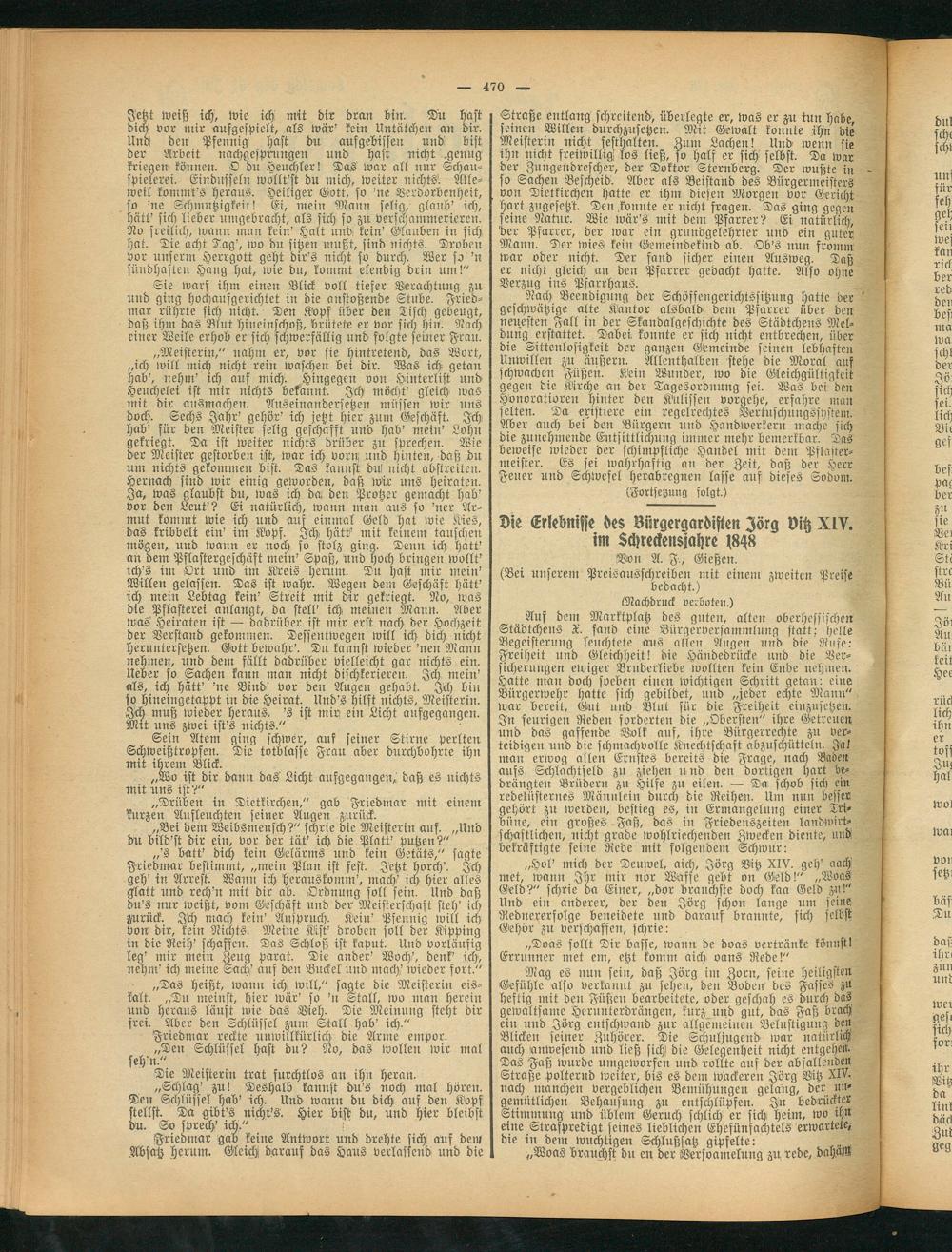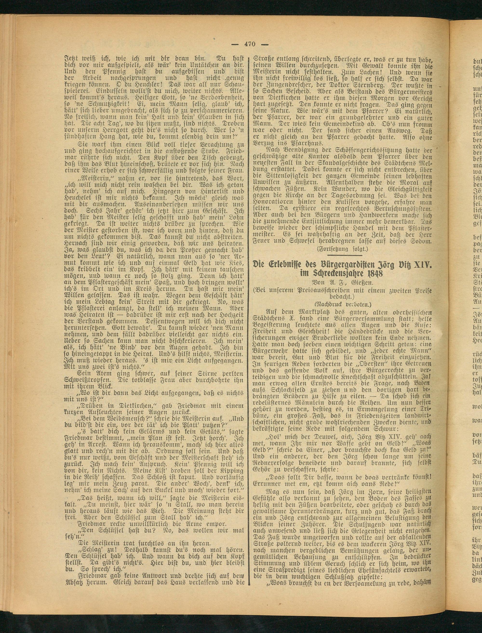 Auf dem Marktplatz des guten, alten oberhessischen Städtchens X. fand eine Bürgerversammlung statt,- helle Begeisterung leuchtete aus allen Augen rind die Rufe: Freiheit und Gleichheit! die Händedrücke und die Versicherungen einiger Bruderliebe wollten kein Ende nehmen. Hatte man doch soeben einen wichtigen Schritt getan: eine Bürgerwehr hatte sich gebildet, und „jeder echte Mann" war bereit, Gut und Blut für die Freiheit einzusetzen. In feurigen Reden forderten die „Obersten" ihre Getreuen und das gaffende Volk auf, ihre Bürgerrechte zu verteidigen und die schmachvolle Knechtschaft abzuschütteln. Ja! mau erwog allen Ernstes bereits die Frage, nach Baden aufs Schlachtfeld zu ziehen und den dortigen hart bedrängten Brüdern zu Hilfe zu eilen. — Da schob sich ein redelüsternes Männlein durch die Reihen. Um nun besser gehört zu werden, bestieg es, in Ermangelung einer Tribüne, eilt großes Faß, das in Friedenszeiten landwirtschaftlichen, nicht grade wohlriechenden Zwecken diente, und bekräftigte seine Rede mit folgendem Schwur: