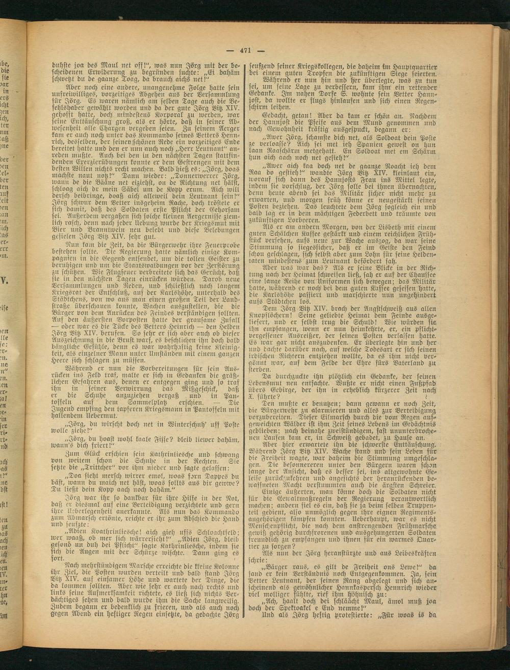 Nun kam die Zeit, da die Bürgerwehr ihre Feuerprobe bestehen sollte. Die Regierung hatte nämlich einige Kompagnien in die Gegend entsendet, um die tollen Geister zu beruhigen und um die Staatswaldungen vor der Zerstörung zu schützen. Wie Flugfeuer verbreitete sich das Gerücht, daß sie in den nächsten Tagen einrücken würden. Darob neue Versammlungen und Reden, und schließlich, nach langem Kriegsrat der Entschluß, aus der Kärlshöhe, unterhalb des Städtchens, von wo aus man einen großen Teil der Landstraße überschauen konnte, Wachen auszustellen, die die Bürger von dem Anrücken des Feindes verständigen sollten. Auf den äußersten Vorposten hatte der grausame Zufall ■— oder war es die Tücke des Vetters Heinrich — den Helden Jörg Bitz XIV. berufen. So sehr er sich aber auch ob dieser Auszeichnung in die Brust warf, es beschlichen ihn doch bald bängliche Gefühle, denn es ivar wahrhaftig keine Kleinigkeit, als einzelner Mann unter Umständen mit einem ganzen Heere sich schlagen zu müssen.