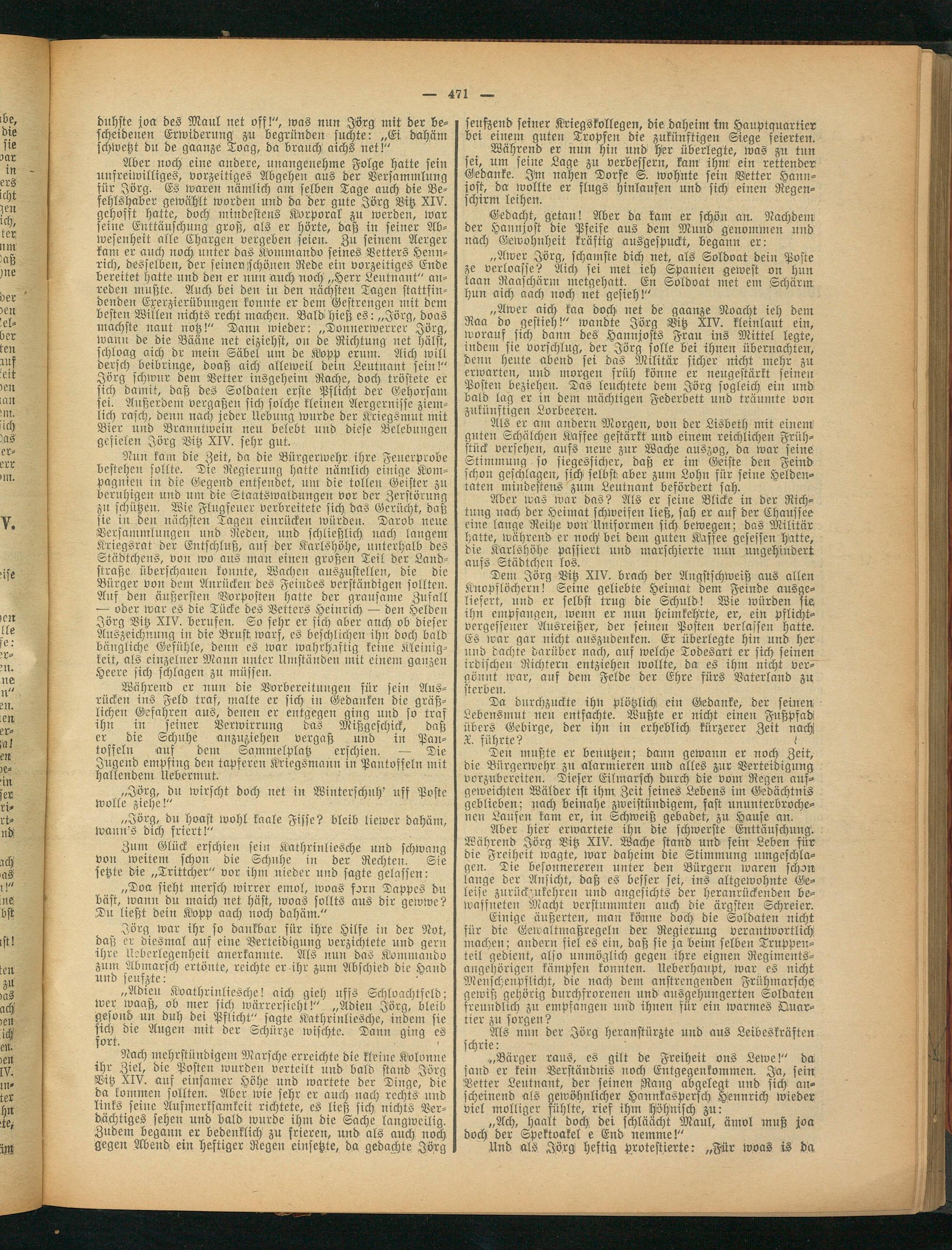 „Awer aich kaa doch uet de gaanze Noacht ieh dem Raa do gestieh!" wandte Jörg Bitz XIV. kleinlaut ein, worauf sich dann des Hannjosts Frau ins Mittel legte, indem sie vorschlug, der Jörg solle bei ihnen übernachten, 'beitu heute abend sei das Militär sicher nicht mehr zu erwarten, und morgen früh könne er neugestärkt seinen Posten beziehen. Das leuchtete dem Jörg sogleich ein und bald lag er in dem mächtigen Federbett und träumte von zukünftigen. Lorbeeren.