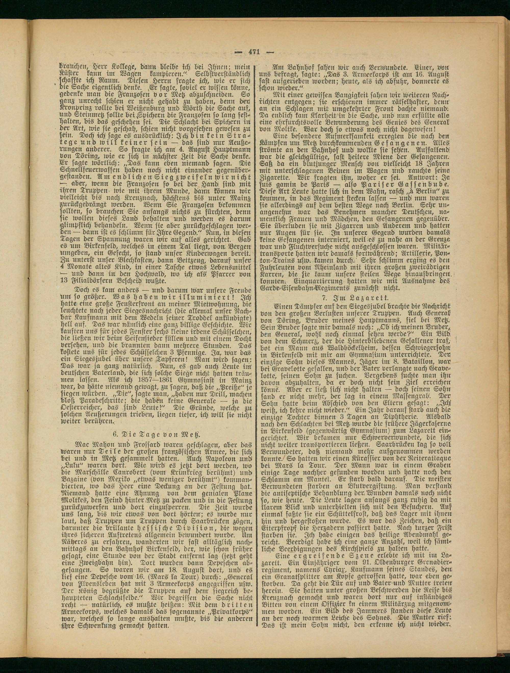 Einen Dämpfer auf den Siegesjubel brachte die Nachricht von den großen Verlusten unserer Truppen. Auch General von Döring, Bruder meines Hauptmanns, fiel bei Metz. Sein Bruder sagte mir damals noch: „Ob ich meinen Bruder^ den General, wohl noch einmal sehen werde?" Ein Bild von deut Schmerz, der die Hinterbliebenen Gefallener traf, bot ein Mann aus Waldböckelheim, dessen Schwiegersohn in Birkenfeld mit mir am Gymnasium unterrichtete. De« einzige Sohn dieses Mannes, Jäger im 8. Bataillon, war bei Gravelotte gefallen, und der Vater verlangte nach Grave- lotte, seinen Sohn zu suchen. Vergebens suchte man ihn davon abzuhalten, da er doch nicht fein Ziel erreichen könne. Mer er ließ sich nicht halten — doch seinen Sohn fand er nicht mehr, der lag in einem Massengrab'. Der Sohn hatte beim Abschied von den Eltern gesagt: „Ich! weiß, ich kehre nicht wieder." Ein Jahr daraus starb auch die einzige Tochter binnen 3 Tagen an Diphtherie. Alsbald nach den Schlachten bei Metz wurde die frühere Jägerkäsernein Birkenfeld (gegenwärtig Gymnasium) znm Lazarett eingerichtet. Wir bekamen nur Schwerverwundete, die sich nicht weiter transportieren ließen. Saarbrücken lag so voll Verwundeter, daß niemand mehr ausgenommen werden konnte. So hatten wir einen Kürassier von der Reiterattaque bei Mars la Tour. Der Männ war in einem Graben einige Tage nachher gefunden worden und hatte noch den Schlamm am Mantel. Er starb bald darauf. Die meisten Verwundeten starben an Blutvergiftung. Man verstand die antiseptische Behandlung der Wunden damals noch nicht so, wie heute. Die Leute lagen anfangs ganz ruhig da mit klarem Blick und unterhielten sich mit den Besuchern. Auf einmal faßte sie ein Schüttelfrost, daß das Lager mit ihnen hin und hcrgestoßen wurde. Es war das Zeichen, daß ein Eiterpfropf die Herzadern passiert hatte. Nach kurzer Frist starben sie. Ich habe einigen das heilige Abendmahl gereicht. Beerdigt habe ich eine ganze Anzahl, weil ich sämtliche Beerdigungen des Kirchspiels zu halten hatte.
