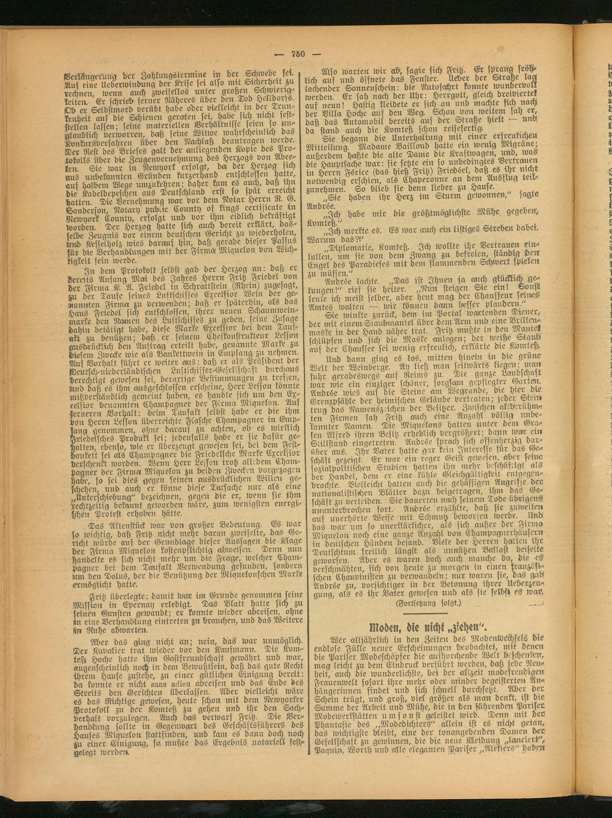 Das Aktenstück war von großer Bedeutung. Es war so wichtig, daß Fritz nicht mehr daran zweifelte, das Gericht würde auf der Grundlage dieser Aussagen die Mage der Firma Miquelon kostenpflichtig abweisen. Denn nun handelte es sich nicht mehr um die Frage, welcher Champagner bei dem Taufakt Verweiidung gefunden, fondern Um den Dolus, der die Benütziing der Miquelonschen Marke ^ermöglicht hatte.