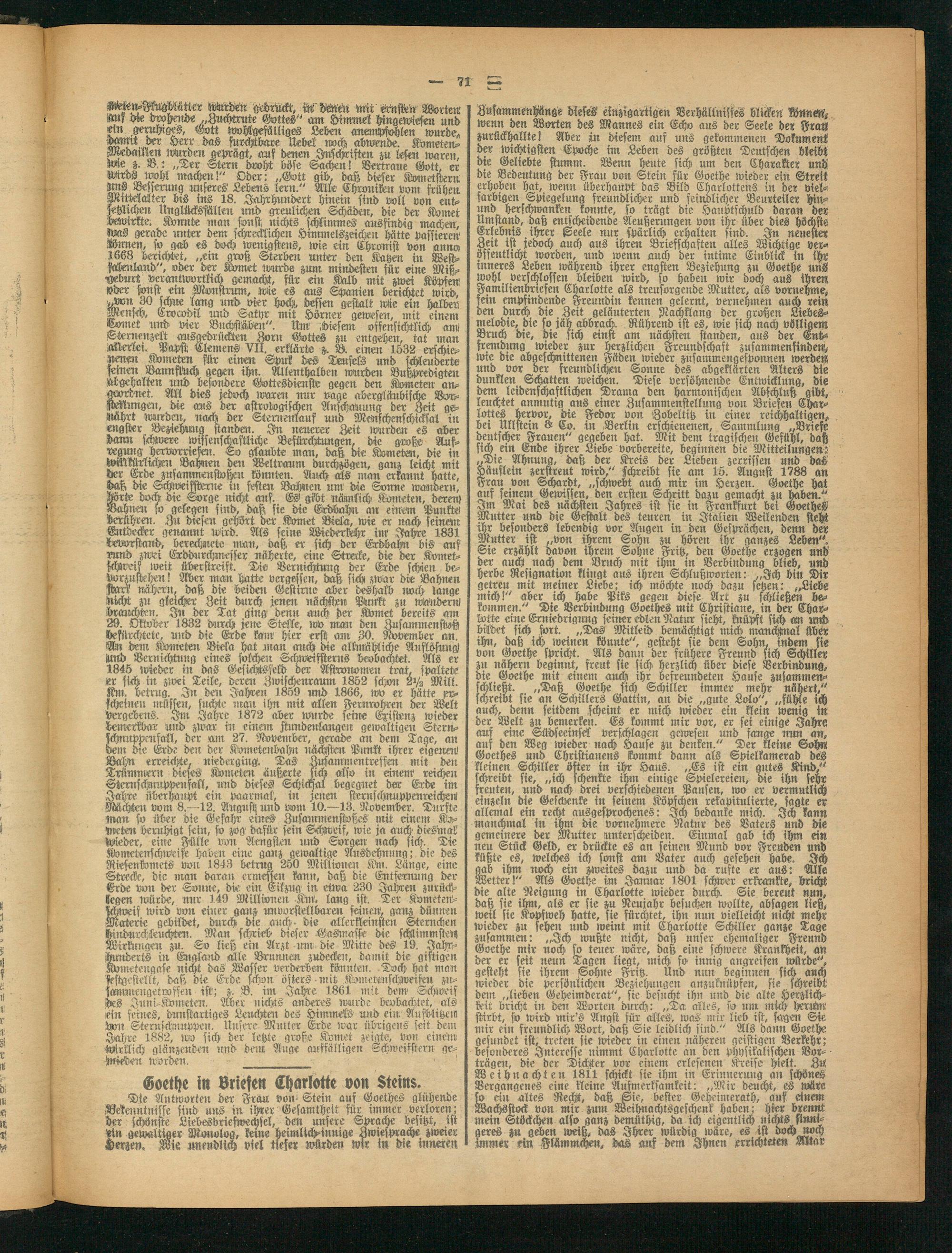 Zusammenhänge dieses' einzigartigen Verhältnisses blicken MnneN, wenn den Worten des Mannes ein Echo aus der Seele der Fraü zurückhallte! Aber in diesem auf uns gekommeneit Dokument der wichtigsten Epoche im Leben des größten Deutschen bleibt die Geliebte stumm. Wenn heute sich um den Charakter und die Bedeutung der Frau von Stein für Goethe wieder ein Streit erhoben hat, wenn überhaupt das Bild Charlottens in der viel-; farbigen Spiegelung freundlicher und feindlicher Beurteiler hiit-- und herschwanken konnte, so trägt die Hauptschuld daran der Umstand, daß entscheidende Aeußerungen von ihr über dies höchste Erlebnis, ihrer Seele nur spärlich erhalten sind. In neuester Zeit ist jedoch auch aus ihren Briefschaften alles Wichtige veröffentlicht worden, und wenn auch der intime Einblick in ihr inneres Leben während ihrer engsten Beziehung zu Goethe uns wohl verschlossen bleiben wird, |o haben wir doch aus ihren. Familienbriefen Charlotte als treusorgeude Mutter, als vornehme, fein empfindende Freundin kennen gelernt, vernehmen auch rein den durch die, Zeit geläuterten Nachklang der großen Liebcs-- melodie, hie so jäh abbrach. Rührend ist es, wie sich nach völligem Bruch die, die sich einst am nächsten standen, aus der End' fremdung wieder zur herzlichen Freundschaft zusammensiuden!, tote die abgeschnittenen Fäden wieder zusammengesponnen werden und vor der freundlichen Sonne des abgeklärten Alters die dunklen, Schatten weichen. Diese versöhnende Entwicklung, die dem leidenschaftlichen Drama den harmonischen Abschluß gibt, leuchtet anmutig aus einer Zusammenstellung von Briefen Charlottes hervor, die Fedor von Zabeltitz in einer reichhaltigen, bei Ullstein & Co. in Berlin erschienenen, Sammlung „Briefe deutscher Frauen" gegeben hat. Mit dem tragischen Gefühl, daß sich ein Ende ihrer Liebe vorbereite, beginnen die Mitteilungen: „Die Ahnung, daß der Kreis der Lieben zerrissen und das Häuflein zerstreut wird," schreibt sie am 15. August 1788 an Frau von Schardt, „schwebt auch mir im Herzen. Goethe hat auf seinem Gewissen, den ersten Schritt dazu gemacht zu haben." Im Mai des nächsten Jahres ist sie in Frankfurt bei Goethes Mutter und die Gestalt des teuren in Italien Weilenden steht ihr besonders lebendig vor Augen in den Gesprächen, denn der Mutter ist „von ihrem Sohn zu hören ihr ganzes Leben". Sie erzählt davon ihrem Sohne Fritz, den Goethe erzogen und der auch nach dem Bruch mit ihm in Verbindung blieb, und herbe Resignation klingt aus ihren Schlußworten: „Ich bin Dir getreu mit meiner Liebe; ich möchte noch dazu setzen: „Liebs mich!" aber ich habe Piks gegen diese Art zu schließen bekommen." Die Verbindung Goethes mit Christiane, in der Charlotte eine Erniedrigung seiner edlen Natur sieht, knüpft sich an und bildet sich fort. „Tas Mitleid bemächtigt mich manchmal über ihn, daß ich weinen könnte", gesteht sie dem Sohn, indem sie von Goethe spricht. Als daun der frühere Freund sich Schiller zu nähern beginnt, freut sie sich herzlich über diese Verbindung, die Goethe mit einem auch ihr befreundeten Hause zusammen-- schließt. „Daß Goethe sich Schiller immer mehr nähert," schreibt sie an Schillers Gattin, an die „gute Lolo", „fühle ich auch, denn seitdem scheint er mich wieder ein klein wenig in der Welt zu bemerken. Es kommt mir vor, er sei einige Jahr« auf eine Südseeinsel verschlagen gewesen und fange mm an, auf den Weg wieder nach Hause zu denken." Der kleine Sohn Goethes und Christianens kommt dann als Spielkamerad des kleinen Schiller öfter in ihr Haus. „Es ist ein gutes Kind," schreibt sie, „ich schenkte ihm einige Spielereien, die ihn sehr freuten, und nach drei verschiedenen Pausen, wo er vermutlich einzeln die Gescvenke in seinem Köpfchen rekapitulierte, sagte er allemal ein recht ausgesprochenes: Ich bedanke mich. Ich kann manchmal in ihm die vornehmere Natur des Vaters und die gemeinere der Mutter unterscheiden. Einmal gab ich ihm ein neu Stück Geld, er drückte es an seinen Mund vor Freuden und küßte es, welches ich sonst am Vater auch gesehen habe. Ich gab ihm noch ein zweites dazu und da rufte er aus: All« Wetter!" Ms Goethe im Januar 1801 schwer erkrankte, bricht die alte Neigung in Charlotte wieder durch. Sie bereut nun, daß sie ihm, als er sie zu Neujahr besuckwn wollte, absagen ließ, weil sie Kopfweh hatte, sie fürchtet, ihn nun vielleicht nicht mehr wieder zu sehen und weint mit Charlotte Schiller ganze Tage zusammen: „Ich wußte nicht, daß unser ehemaliger Freund Goethe mir noch so teuer wäre, daß eine schwere Krankheit, an der er seit neun Tagen liegt, mich so innig angreifen würde", gesteht sie ihrem Sohne Fritz. Und nun beginnen sich auch wieder die. persönlichen Beziehungen anzuknüpfen, sie schreibt dem „lieben Geheimderat", sie besucht ihn und die alte Herzlichkeit bricht in den Worten durch: „Da alles, so nm mich heru!m stirbt, so wird mir's Angst für alles, was mir lieb ist, sagen Sie mir ein freundlich Wort, daß Sie leidlich sind." Als dann Goethe gesundet ist, treten sie wieder in einen näheren geistigen Verkehr; besonderes Interesse nimmt Clmrlotte an den Physikalischen Vor-- trägen, die der Dichter vor einem erlesenen Kreise hielt. Zu Weihirachten 1811 schickt sie ihm in Erinnerung an schönes Vergangeites eine kleine Aufmerksamkeit: „Mir deucht, eS wär« so ein altes Recht, daß Sie, bester Geheimerath, aus einem Wachsstock von mir zum Weihnachtsgeschenk haben; hier brennt mein Stückchen also ganz demüthig, da ich eigentlich nichts sinni- Sces zu geben weiß, das Ihrer würdig wäre, es ist doch noch