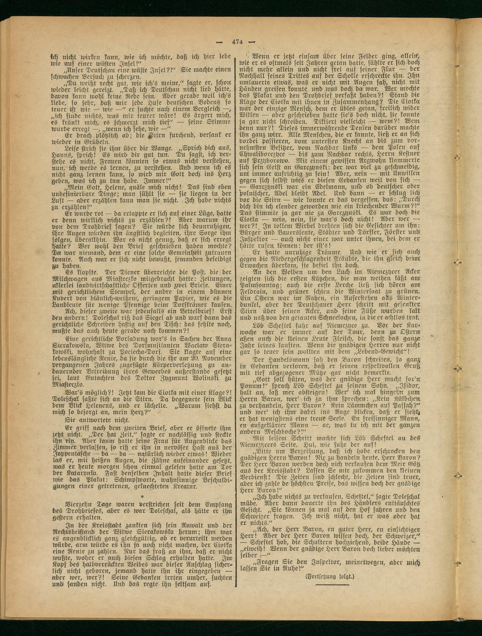 Es klopste. Der Diener überreichte die Post, die der Milchwagen aus Miasteczko mitgebracht hatte: Zeitungen, allerlei landwirtschaftliche Offerten und zwei Briefe. Einer mit gerichtlichem Stempel, der andre in einem dünnen Kuvert von bläulich-weißem, geringem Papier, wie es die Landleute für wenige Pfennige beim Dorfkrämer kaufen.