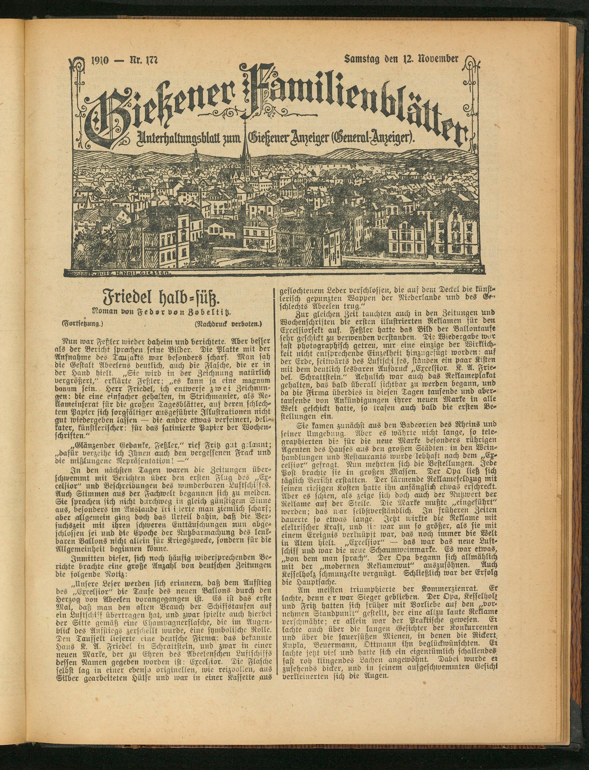 „Unsere Leser werden sich erinnern, daß dem Aufstieg des „Exeelsior" die Taufe des neuen, Ballons durch den Herzog von Abeelen vorangegangen ist. Es ist das erste Mal, daß man den alten Brauch der Schiffstaufen auf ein Luftschiff übertragen hat, und zwar spielte auch hierbei der Sitte gemäß eine Champagnerflasche, die int Augenblick des Aufstiegs zerschellt wurde, eine symbolische Rolle. Den Taufsekt lieferte eine deutsche Firma: das bekannte Haus K. A. Friedel in Schrattstein, und zwar in _ einer neuen Marke, der zu Ehren des Abeelenschen Luftschiffs dessen Namen gegeben worden ist: Excelstor. Die Flasche selbst lag in einer ebenso originellen, wie reizvollen, aus Silber gearbeiteten Hülse und war in einer Kassette aus