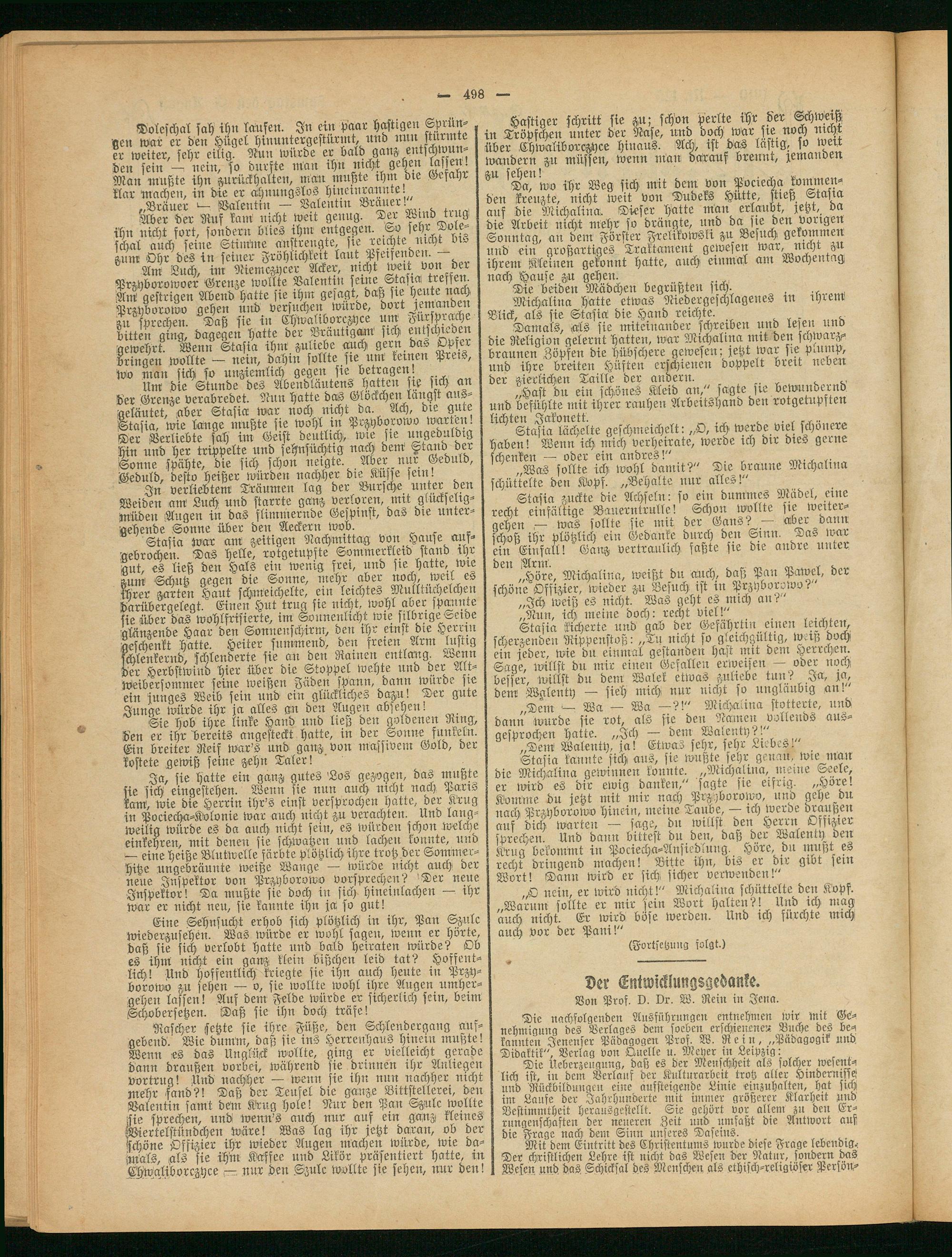 Stasia sicherte und gab der Gefährtin einen leichten, scherzenden Rippenstoß: „Tii nicht so gleichgültig, wug doch ein jeder, wie du einmal gestanden hast mit dem Herrchen. Sage, willst du mir eilten Gefallen erweisen — oder noch besser, willst du dem Malek etwas zuliebe tun? Ja, ja, dem Walenty — sieh mich nur nicht so ungläubig an!