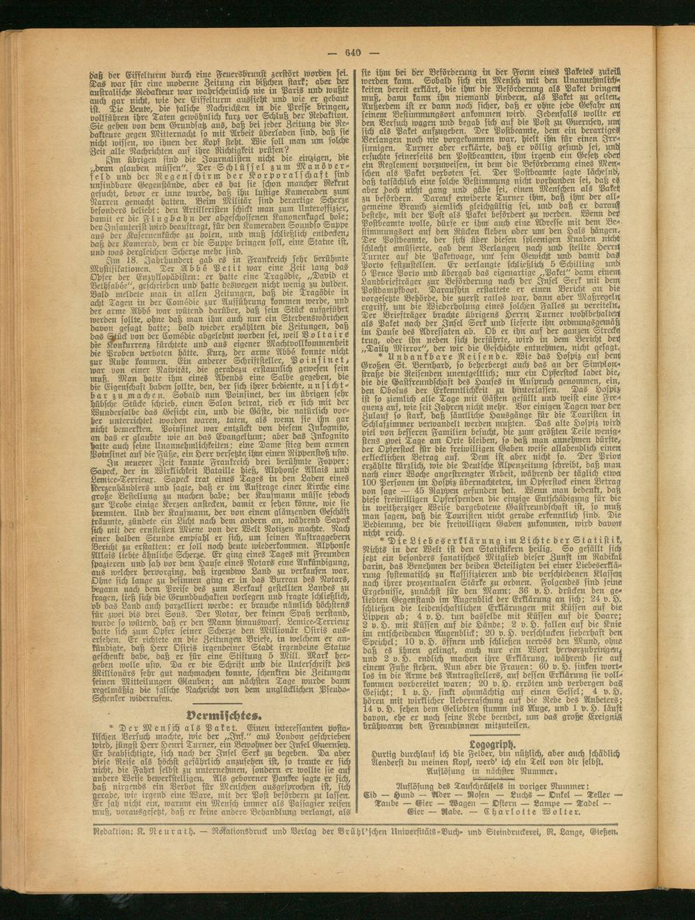 Redaktion: K. Neurath. — Rotationsdruck und Verlag der Brühl'schen Universitäts-Buch- und Steindruckerei, R. Lange, Gießen.