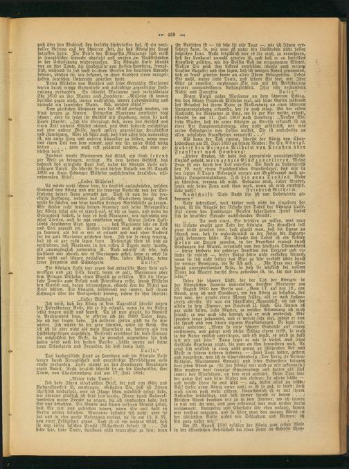 funb über den Eindruck, den derselbe hinterlassen hat, ist ein ivert- Poller Beitrag aus der schweren Zeit, hie das Königliche Hans getroffen hatte. Die Briefe der Prinzessin Marianne sind meist pt französischer Sprache abgefaßt und Werden am Nachstehenden in der Uebersetzüng wiedergegeben. Die Königin Luise schreibt nur an ihre Tante, die Landgräfin Non Hessen-Homburg, französisch, während sie sich sonst in ,ihren Briefen der deutschen Sprache bedient, obschon sie, wie bekannt, in ihrer Kindheit einen mangelhaften deutschen Unterricht genossen hatte.
